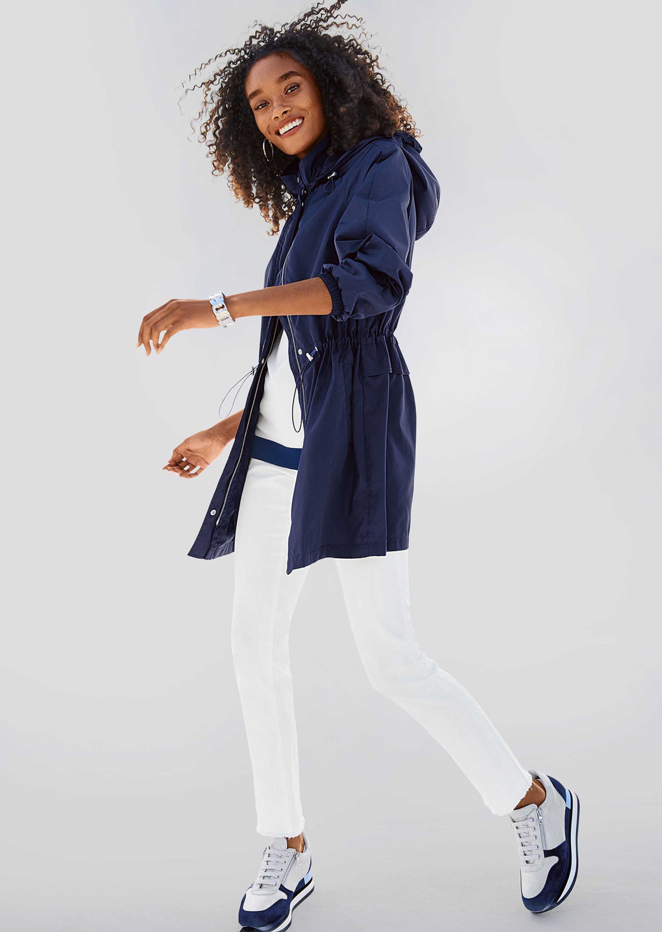 Die typische Lieblingsjacke für die unterschiedlichsten Wetterlagen! Der Sommerparka mit Kapuze ist der perfekte Partner für all Ihre Pläne. In ungefütterter Leichtvariante trägt er sich angenehm und kommt schön feminin auf Figur. Ausgestattet ist er mit Stehkragen, Logodruckern, 2-Wege-Zipper, Schubtaschen und Langarm mit Gummizugbund. Dank Tunnelzug mit Metallstoppern in der Taille und in der abnehmbaren Kapuze können Sie ihn individuell regulieren. Kombinieren Sie ihn zu strahlendem Weiß für einen starken Kontrast!