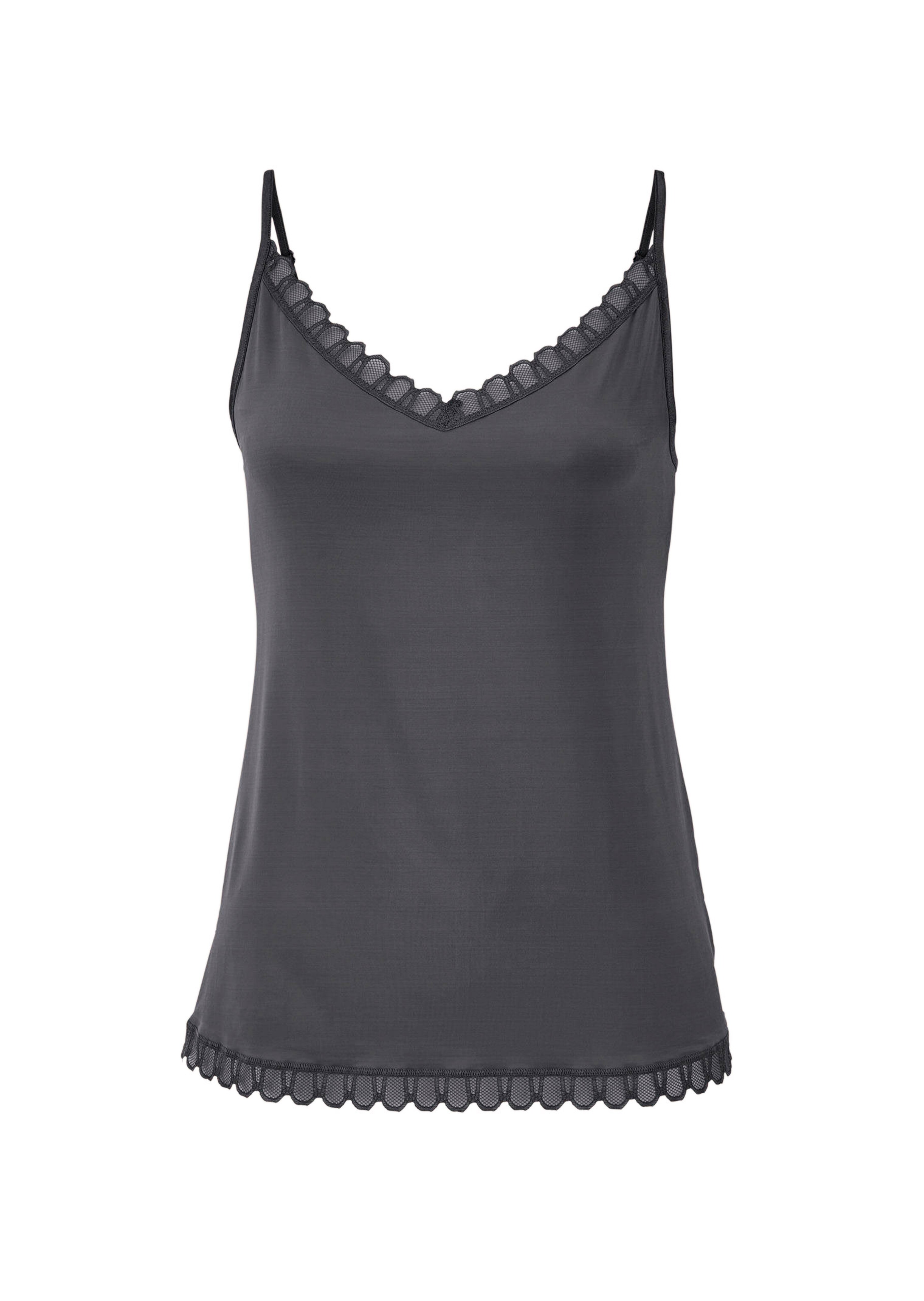 Zarte Details treffen auf fließende Materialien. Das Spaghetti-Trägerhemd von MEY überzeugt mit seidig-weicher Viskose, die sanft über die Haut gleitet. Feine Spitzenborten am Ausschnitt und Saum setzen elegante Akzente, während die verstellbaren Träger im Rücken individuellen Komfort bieten. Ob solo oder als feines Layering unter Blusen, das Top sorgt für femininen Look und angenehmes Tragegefühl.