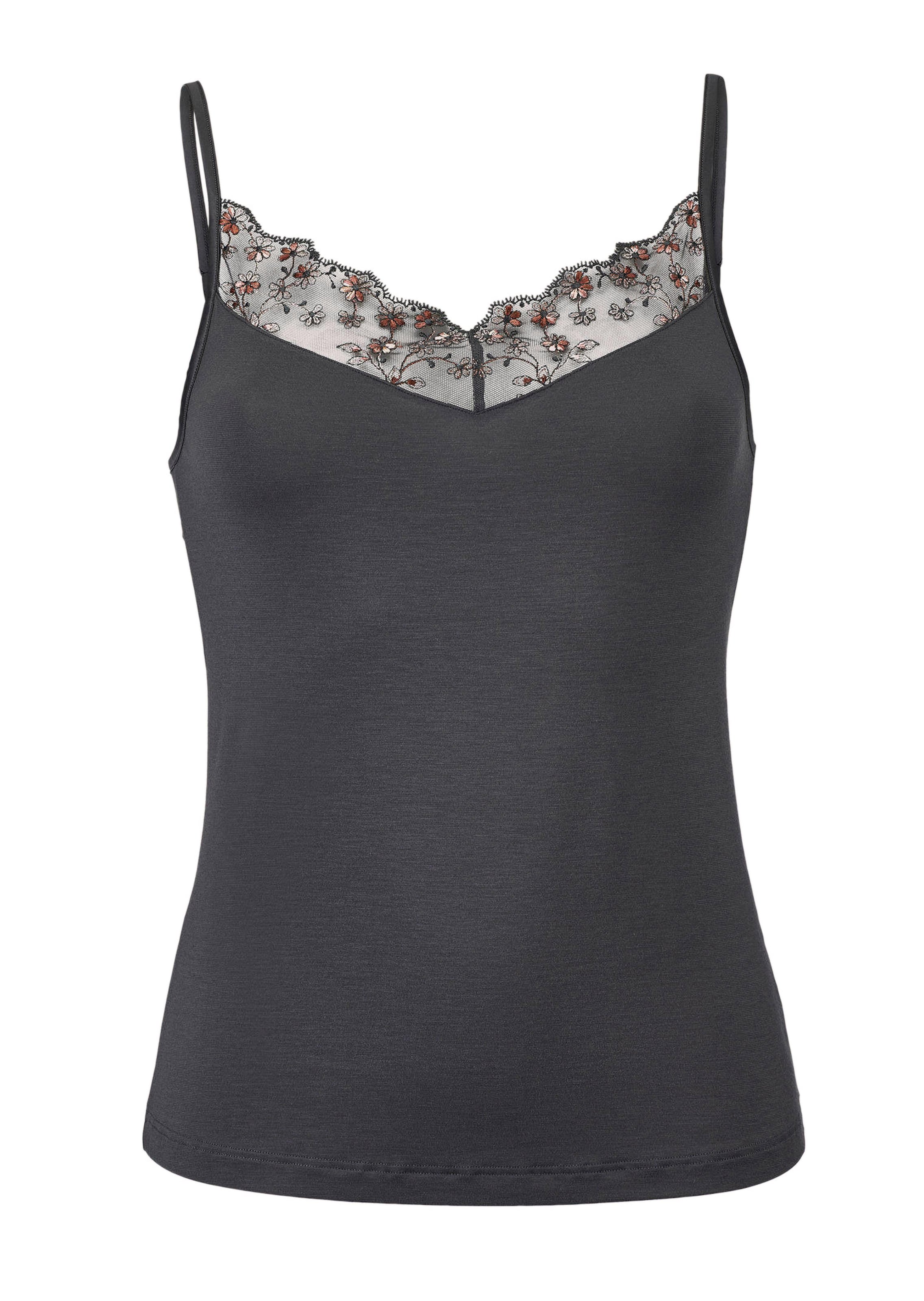 Feminin und elegant zugleich zeigt sich das Spaghetti-Trägerhemd von MEY aus feiner Modalqualität. Der leichte V-Ausschnitt wird von zarter, floraler Stickereispitze am Dekolleté betont, die glänzenden Satinträger lassen sich im Rücken verstellen. Die schmale Schnittführung sorgt für einen harmonischen Sitz, während die unglaublich weiche Qualität besonders angenehm auf der Haut liegt. Ideal solo oder als edles Layering zu Blusen und leichten Sommerhosen.