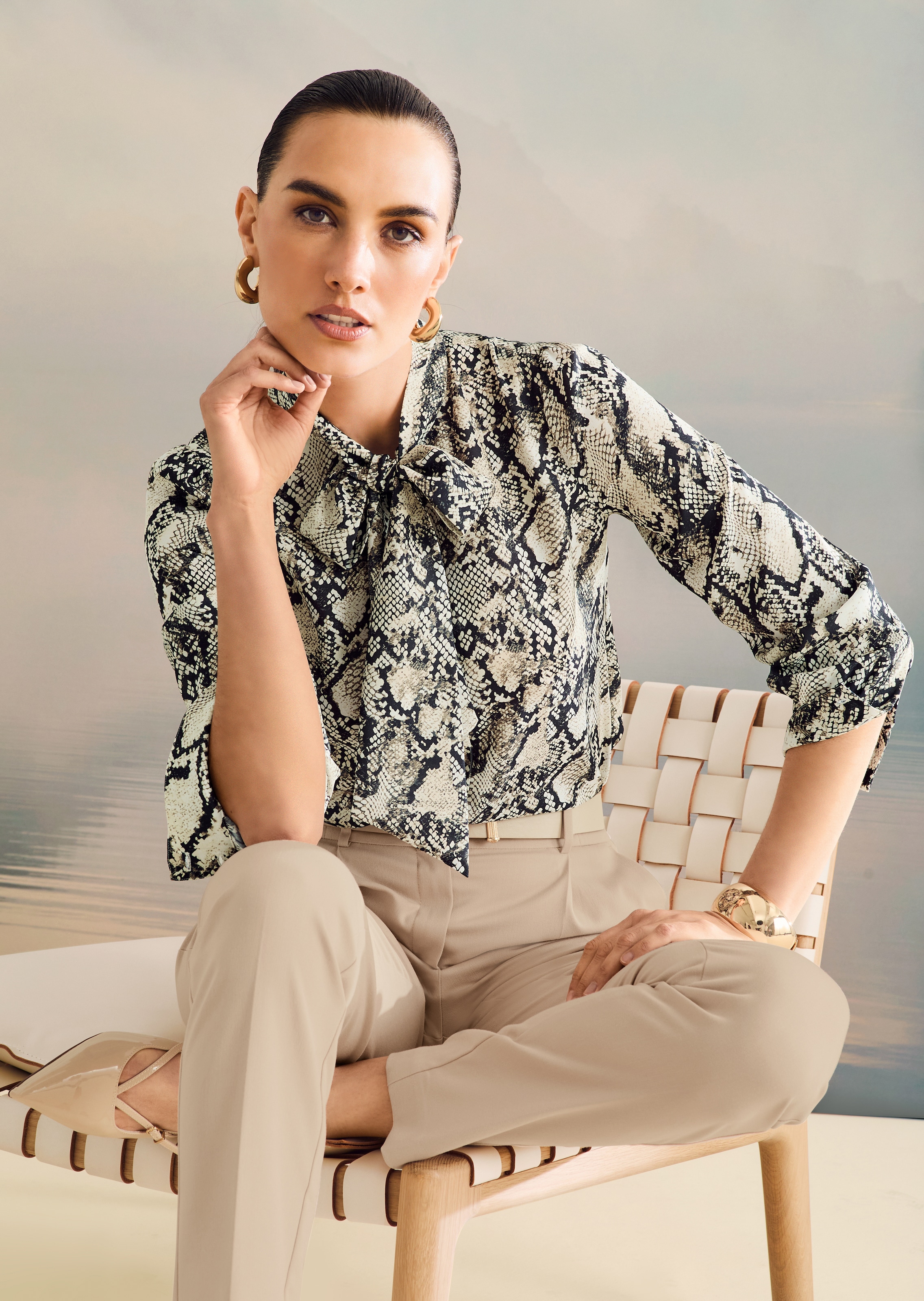 Ein modisch lässiger Look, der mit femininer Raffinesse glänzt und durch ausdrucksstarken Animal-Print ein aktuelles Statement setzt. Die fließende Silhouette schmeichelt der Figur und eignet sich durch die leicht gerundete Saumkante ideal zum lockeren darüber tragen – perfekt für entspannte und dennoch elegante Auftritte. Ein besonderes Highlight ist der kleine Stehkragen mit langem Bindeband. Dieses kann individuell gestaltet werden und verleiht der Bluse je nach Styling eine verspielte oder elegante Note. Die Ärmel in attraktiver 3/4-Länge sind an der Schulter zart gekräuselt und schließen mit klassischen Knopfmanschetten ab – eine harmonische Kombination aus femininer Leichtigkeit und Klassik. Die Rückenpartie mit Passe und Quetschfalte unterstreicht die Liebe zum Detail und sorgt für eine angenehme Passform. Ein unverzichtbares Essential für die anspruchsvolle Garderobe.