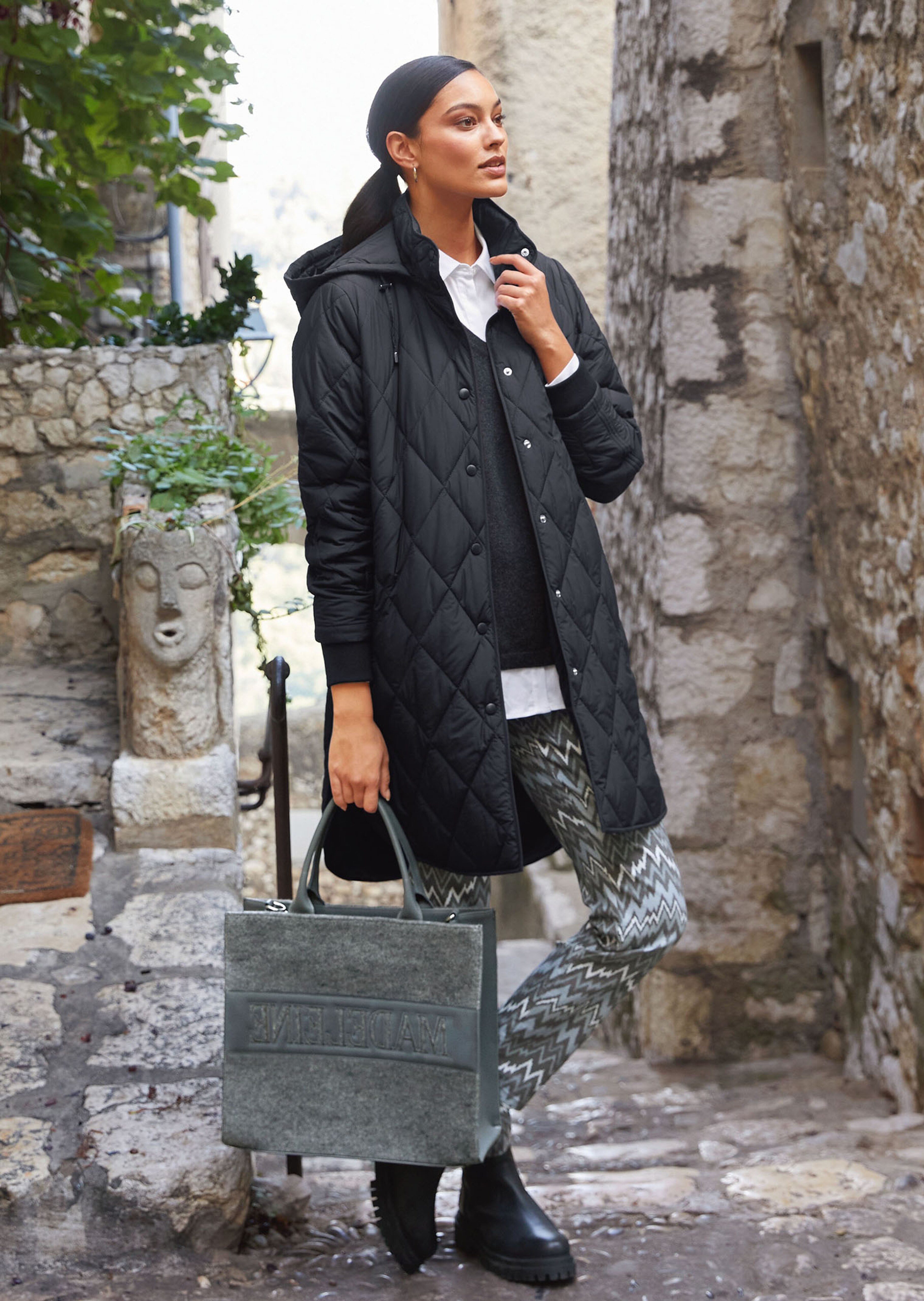 Outdoor-Luxus, wie wir ihn lieben. Der angenehm leichte und wärmend wattierte Steppmantel ist sehr modisch in lässiger Oversized-Form gestylt. Er hat einen Stehkragen, eine abnehmbare Kapuze mit Tunnelzug und Metallstoppern, eine Druckknopfleiste und schräge Leistentaschen mit Druckknopfverschlüssen. Seitliche Schlitze sorgen für mehr Bewegungsfreiheit. Die langen Ärmel haben windabweisende Rippstrickabschlüsse, die Schulterpartie ist dezent überschnitten.