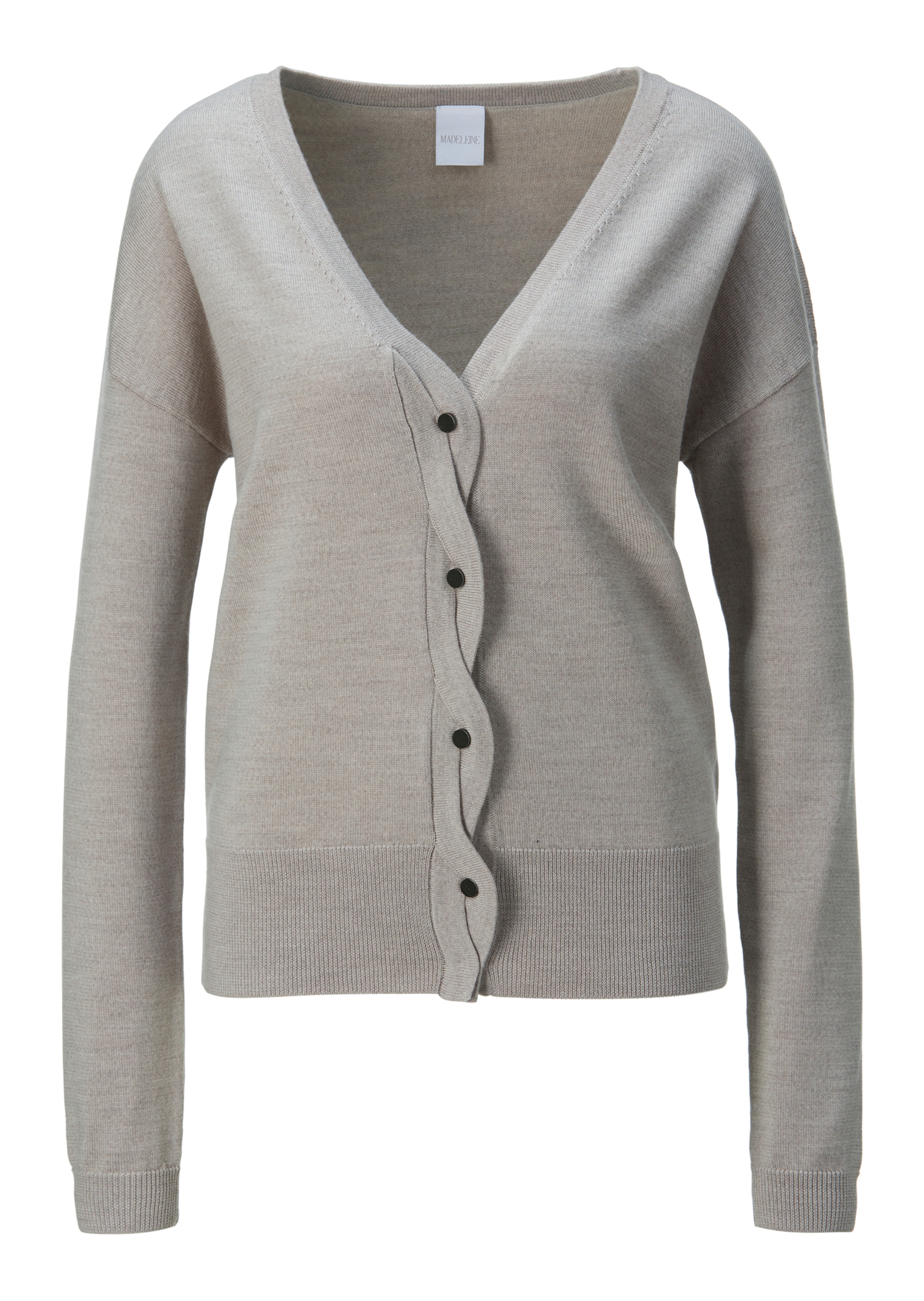 Sie ist kuschelig weich, angenehm warm und begeistert mit ihrer femininen Gestaltung. Die Strickjacke aus Merinowolle hat eine kustvoll gestaltete Knopfleiste in Zopfoptik. Ihr weicher Griff und wertvoller Charakter machen sie zur Favoritin femininer Looks. Der stilvolle Langarm-Cardigan ist mit tonigen Knöpfen, breitem Bündchen und schmalen Ärmelbündchen gestaltet. Durch die schlanke Form können Sie sie auch innerhalb des Bundes tragen. Ob elegant oder lässig kombiniert: Der Strickcardigan verleiht dem Styling das feminine Extra.