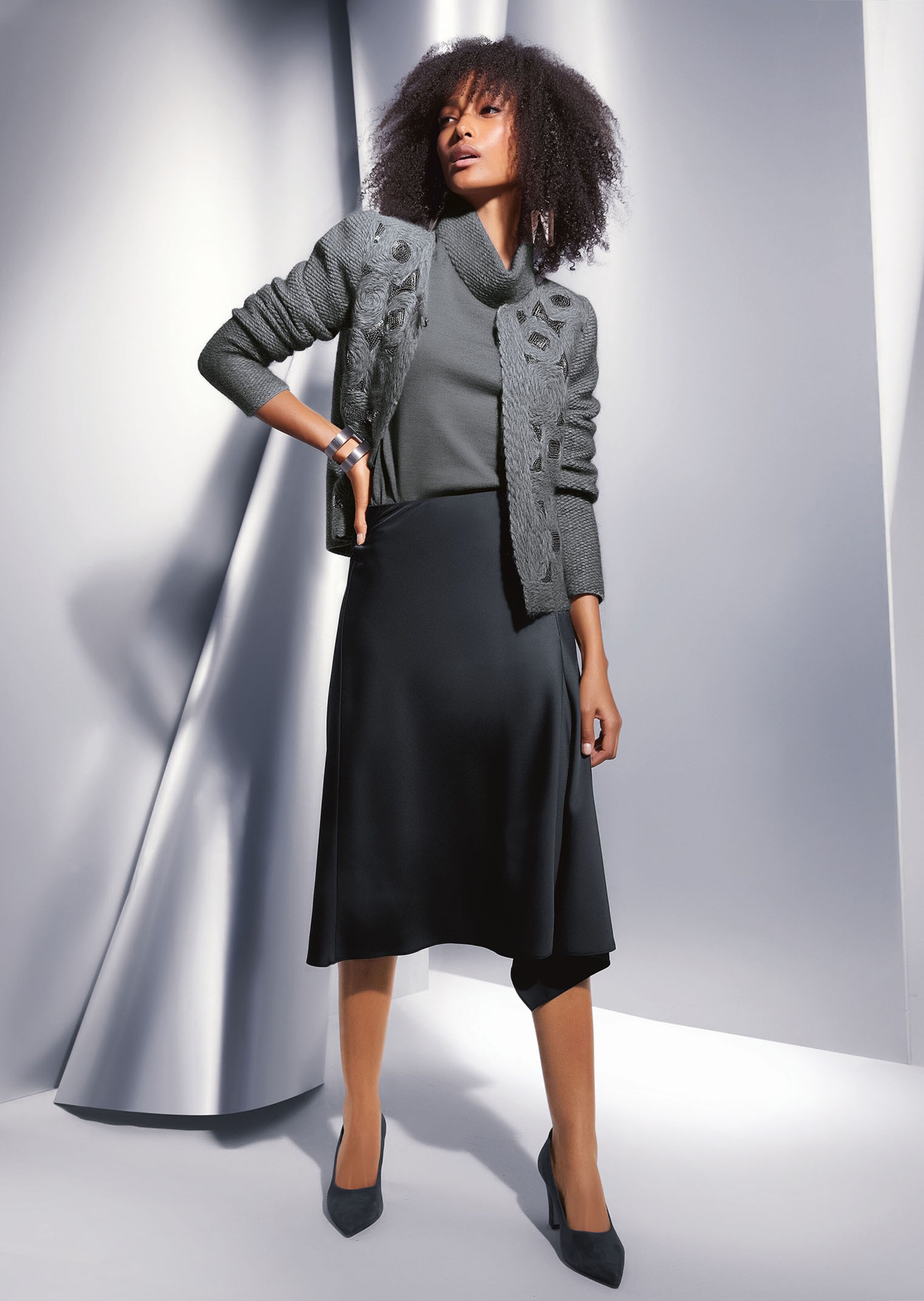 Ihr zauberhafter Strukturmix, der edle Glanz und die attraktive Kurzform machen die Strickjacke zum absoluten Maschen-Highlight. Ein Trendbegleiter, der mit viel Raffinesse begeistert und eindrucksvolle Akzente setzt. Die hochwertige, italienische Garnmischung ist weich im Griff und lässt die Herzen vieler Strickliebhaber höher schlagen. Ihre vielfältigen Kombinations-Möglichkeiten machen das Lieblingsstück sehr begehrenswert und sorgen auch bei festlichen Anlässen für Furore. Der Grobstrick an Rücken und langen Ärmeln wird im Vorderteil von verspieltem Kordel-Strick und Partien aus glanzvollen Pailletten abgelöst. Sie setzen den Modepartner trendstark in Szene und bringen eine ordentliche Prise Glamour in den Look. Die leicht legere Form der Jacke ist mit klassischem Rundhals-Ausschnitt gearbeitet, der an der Vorderseite per Haken zu schließen ist.