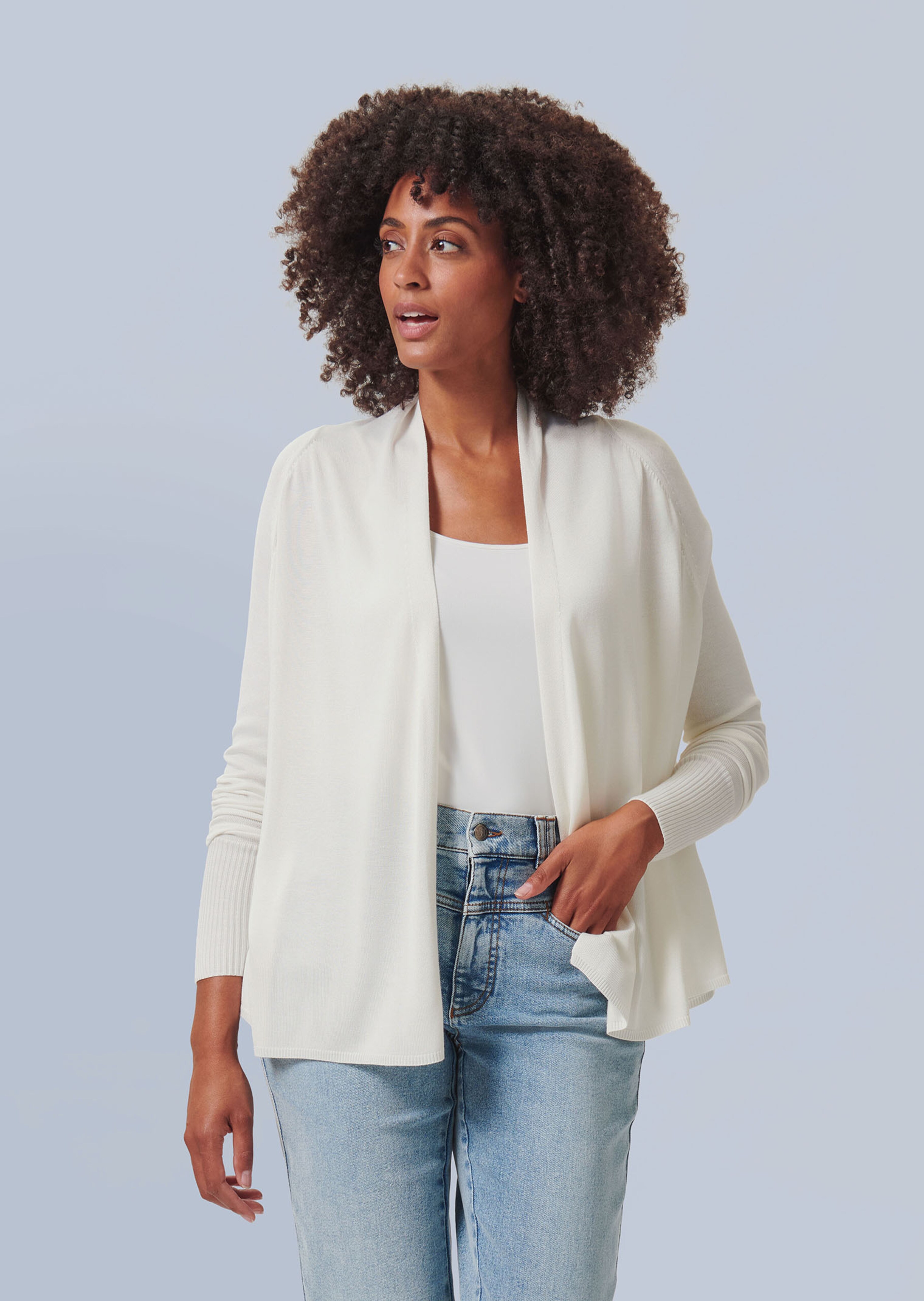 Eine Schmeichlerin: Die Strickjacke mit Schalkragen trägt sich durch den natürlichen Sommerfeinstrick aus Baumwolle, Viskose, Leinen und Kaschmir so angenehm. Die verschlusslose Form mit Rippenabschlüssen an den Ärmeln lässt sich auch gut im Lagenlook mit einem längeren Darunter kombinieren. Mit nachhaltigen Viskosefasern der Marke LENZING™ ECOVERO™