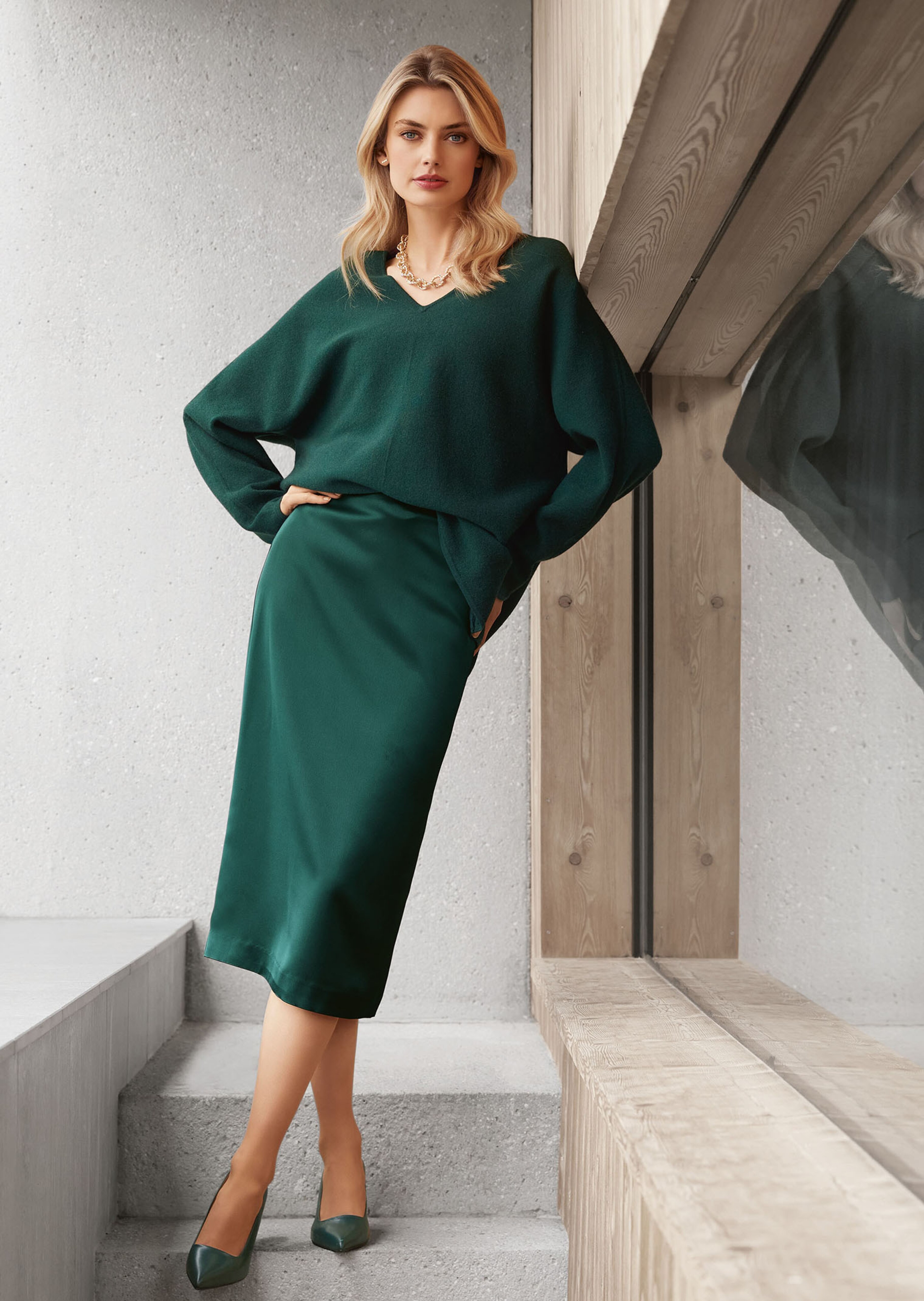 Ein Maschenpartner, der vielseitig kombiniert werden kann und mit modischer Raffinesse glänzt. Trendy »oversized« punktet der Pullover mit viel Trage-Komfort und bringt durch den breiten, abnehmbaren Schalkragen Abwechslung ins Spiel. Hochwertiger Milano-Strick mit V-Ausschnitt und langen Ärmeln wurde aufwendig in Form gearbeitet. Tubular-Nähte runden den Style liebevoll ab.