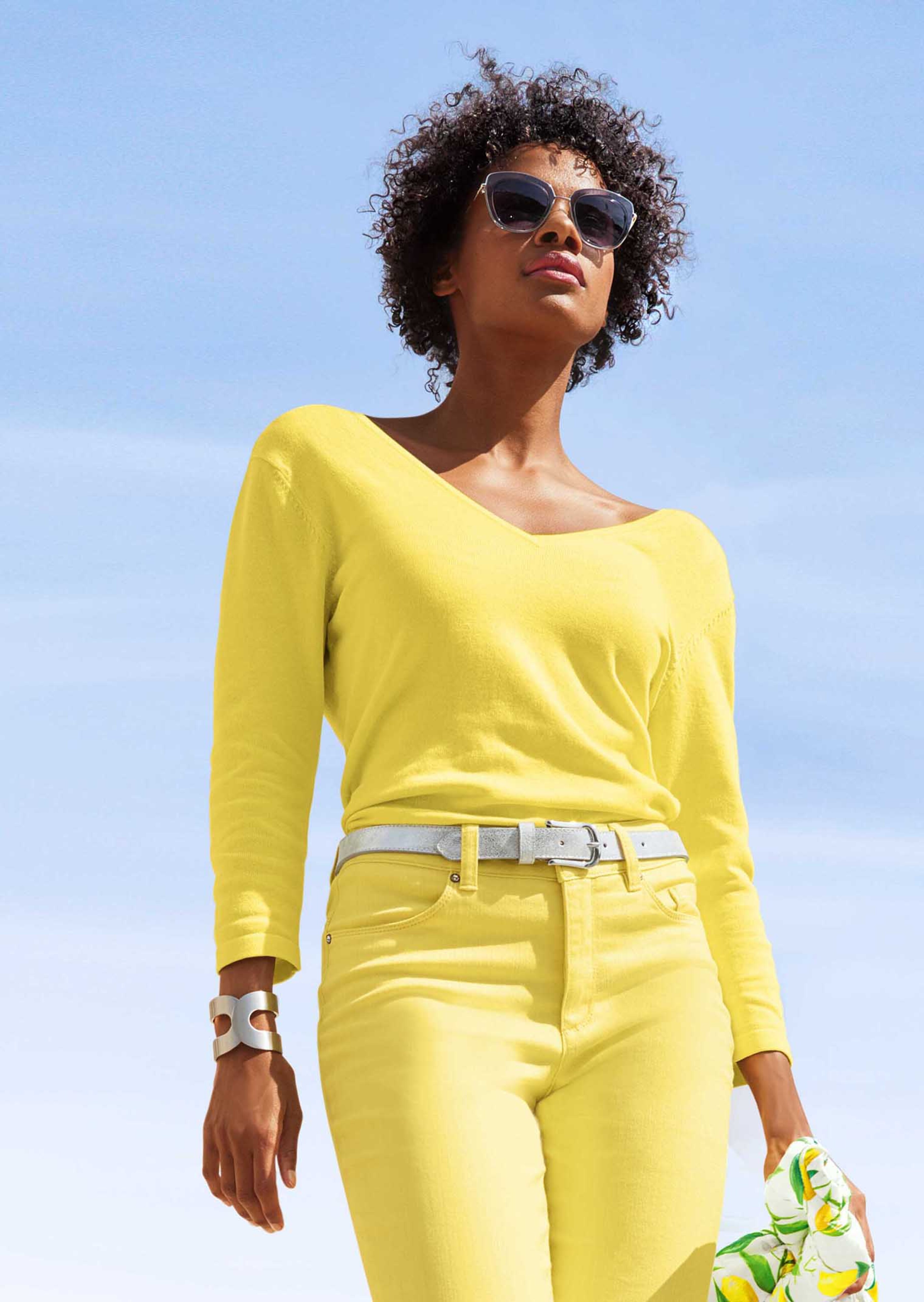 Für unzählige Stylings ein aufregender Partner: der Strickpullover mit tiefem Rückenausschnitt. Elastischer Viskose-Stretch gibt ihm den weichen Charakter. Der feminine V-Ausschnitt wiederholt sich sexy im Rückteil. Schlanker, leicht taillierter Damenpullover mit 3/4-Ärmeln. Ob am Tag oder am Abend: der Strickpullover mit tiefem Rückenausschnitt ist ein Blickfang.