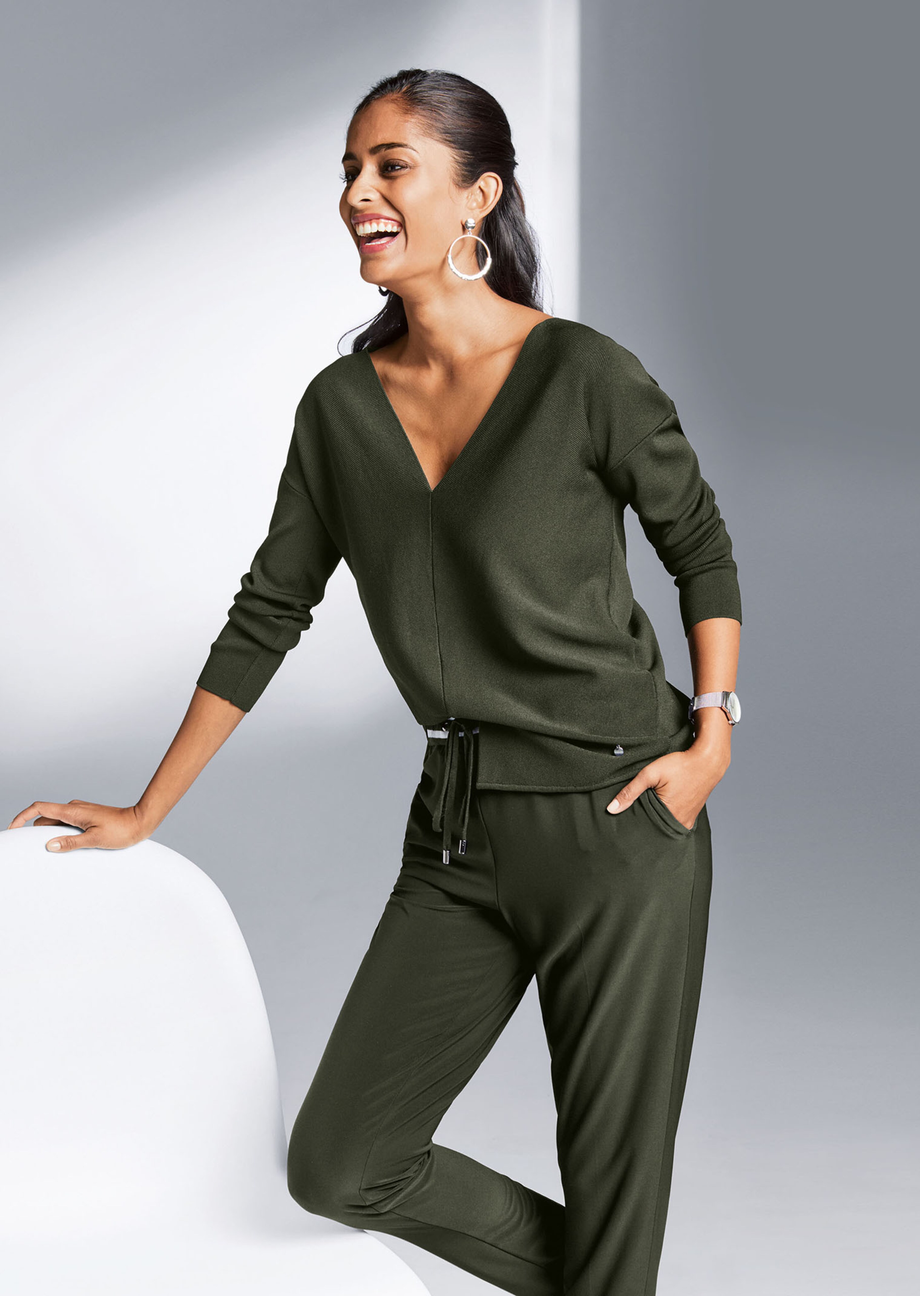 Sein eleganter Purismus macht ihn zum Favoriten! Der Strickpullover mit V-Ausschnitt transportiert mit seinem schlichten Look Eleganz. Sein edler Strick im modernen Querverlauf trägt sich durch den Viskose-Mix so angenehm. Wir haben ihn für einen femininen Look mit überschnittenen Schultern und Langarm in Form stricken lassen. Durch seine zeitlose Klasse ist er ein Styling-Allrounder für die unterschiedlichsten Anlässe.