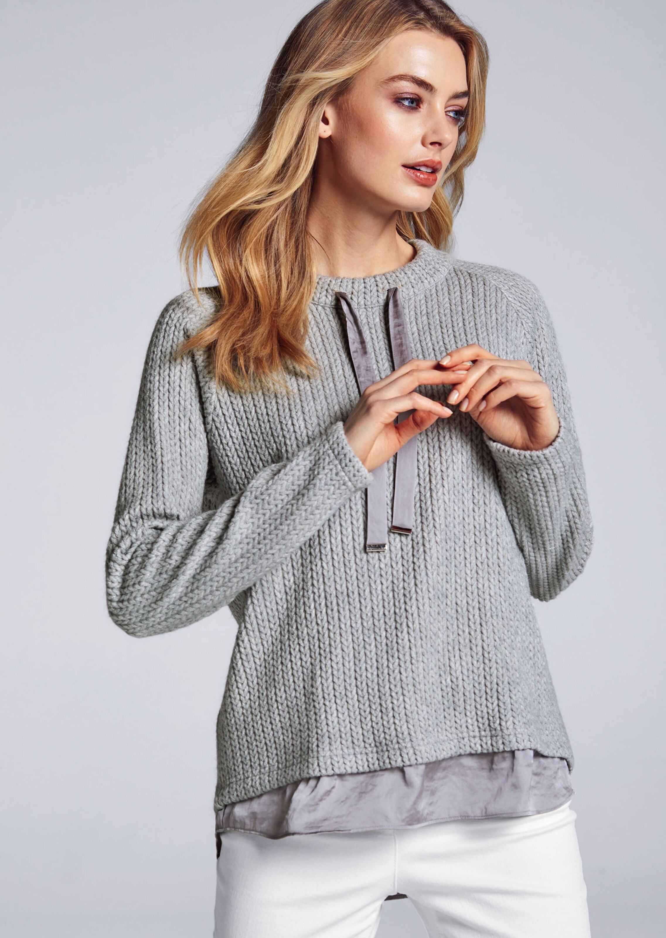 Ein Sweatshirt in Strickoptik, das mit seiner Detailgestaltung begeistert. Die raffinierte Two-in-One-Optik entsteht durch den Satineinsatz am Saum, der ein daruntergezogenes Shirt imitiert. Der weiche Jersey in Grobstrickoptik trägt sich super bequem durch den Viskose-Mix. Satinbändchen setzen den zusätzlichen Akzent. Wir haben es für einen modernen Look leicht tailliert mit Rundhalsausschnitt und Langarm gestaltet. Kombinieren Sie es zu weißen Partnern für einen frischen, entspannten Trendlook der Saison.