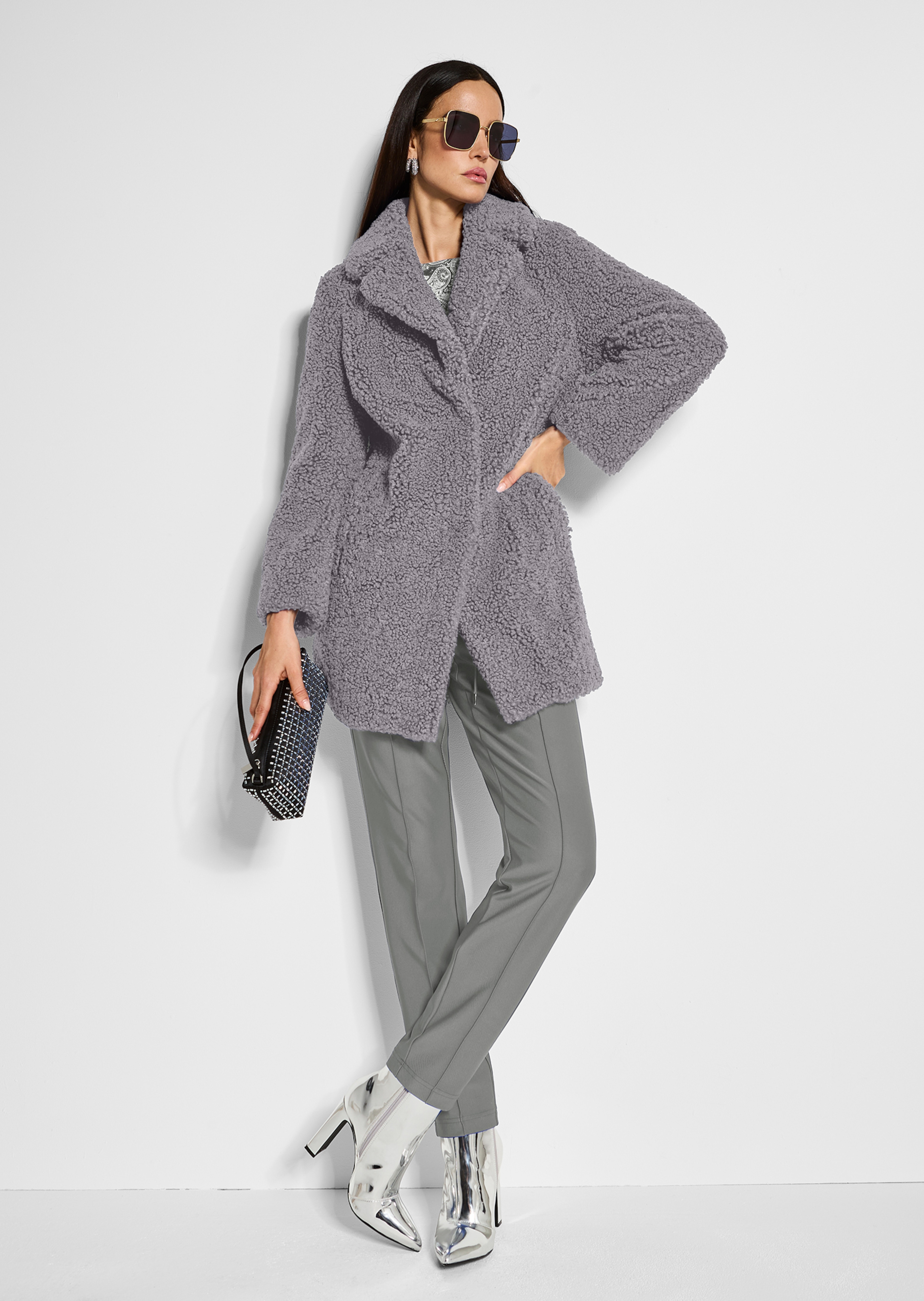 Wohlgefühl und Stil in perfekter Harmonie! Flauschig weicher Webpelz sorgt in stylischem Teddy-Look für Furore und hƤlt angenehm warm. Der Mantel ist komfortabel geschnitten und mit Reverskragen, überschnittener Schulter, langen Ćrmeln und drei vorderseitigen Druckknƶpfen gearbeitet. Mit schrƤg eingearbeiteten Leistentaschen und einer Innentasche für zusƤtzlichen Stauraum.