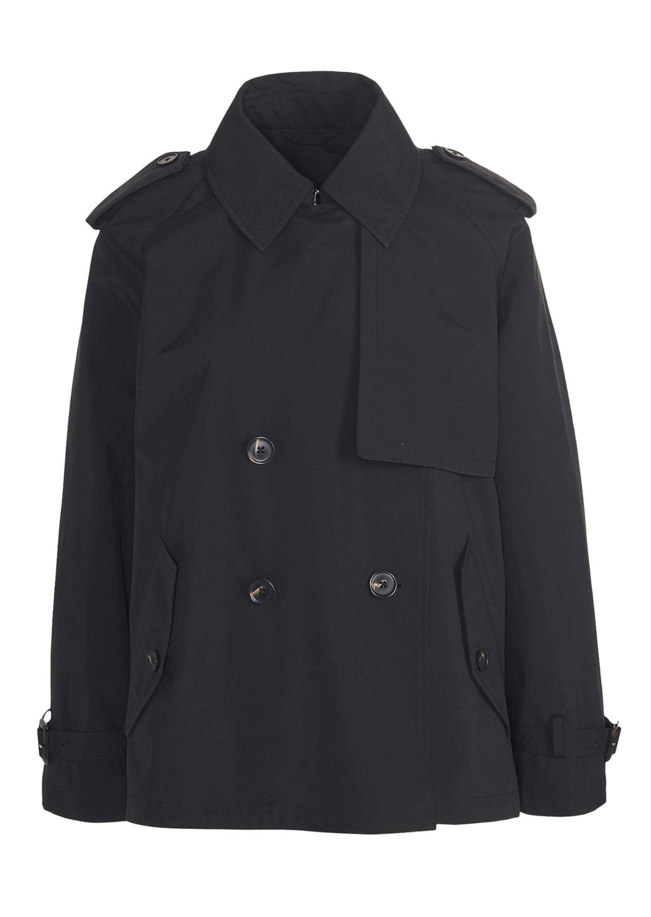 im Rückteil länger geschnitten als vorne. Schulterpartie und Ärmel mit den für einen Trenchcoat typischen Details.