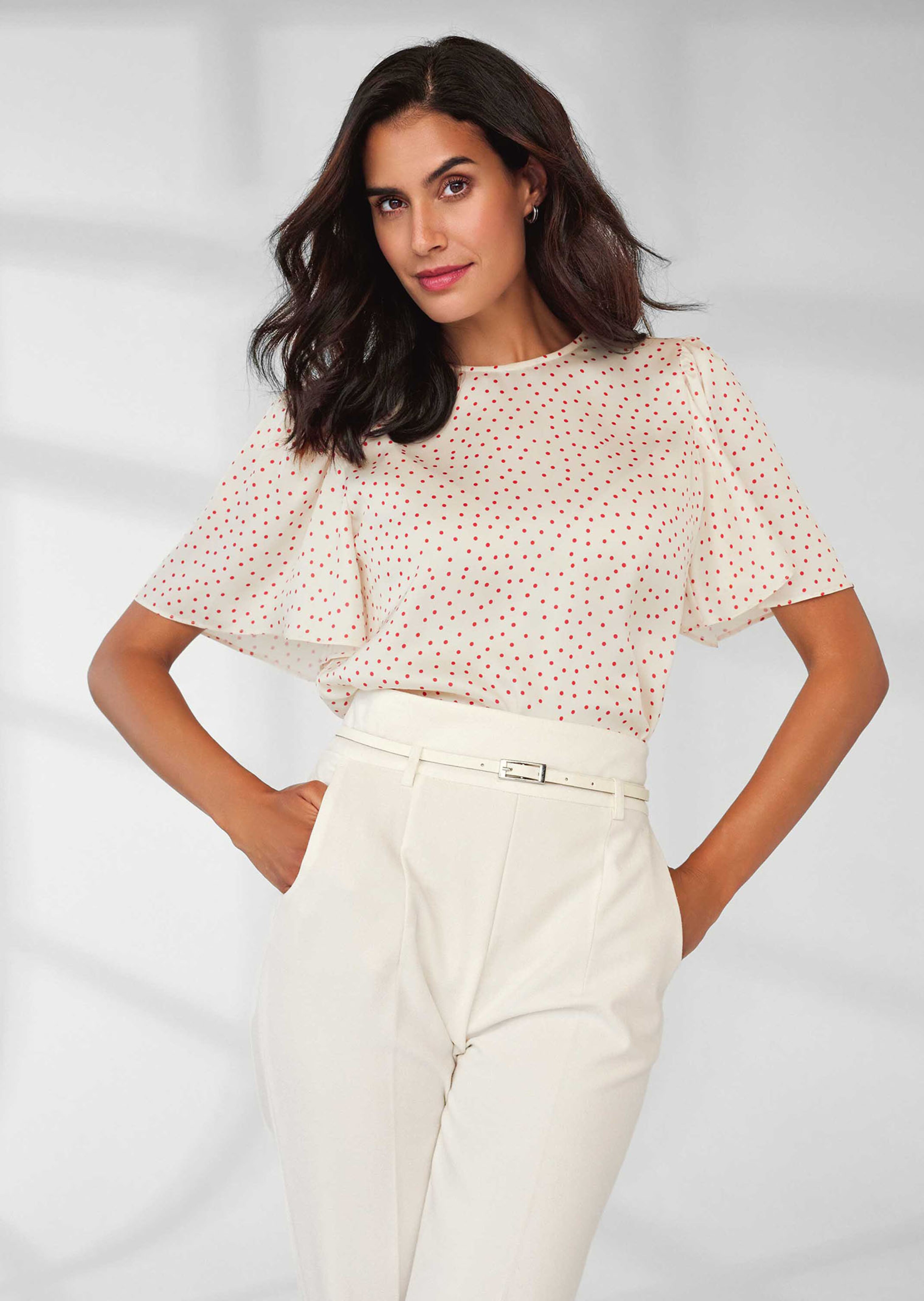 Mit Pünktchenprint und modischen Details bringt diese Bluse einen unwiderstehlichen Charme in Ihren Look. Der edle Twill in nachhaltiger Qualität verleiht ihr den feinen Glanz und seidigen Griff. Ein hinreißend femininer Style mit Rundhals-Ausschnitt, Volumenärmel, Kräuselung an der Schulter und kleinem Rückenschlitz mit Knopf.