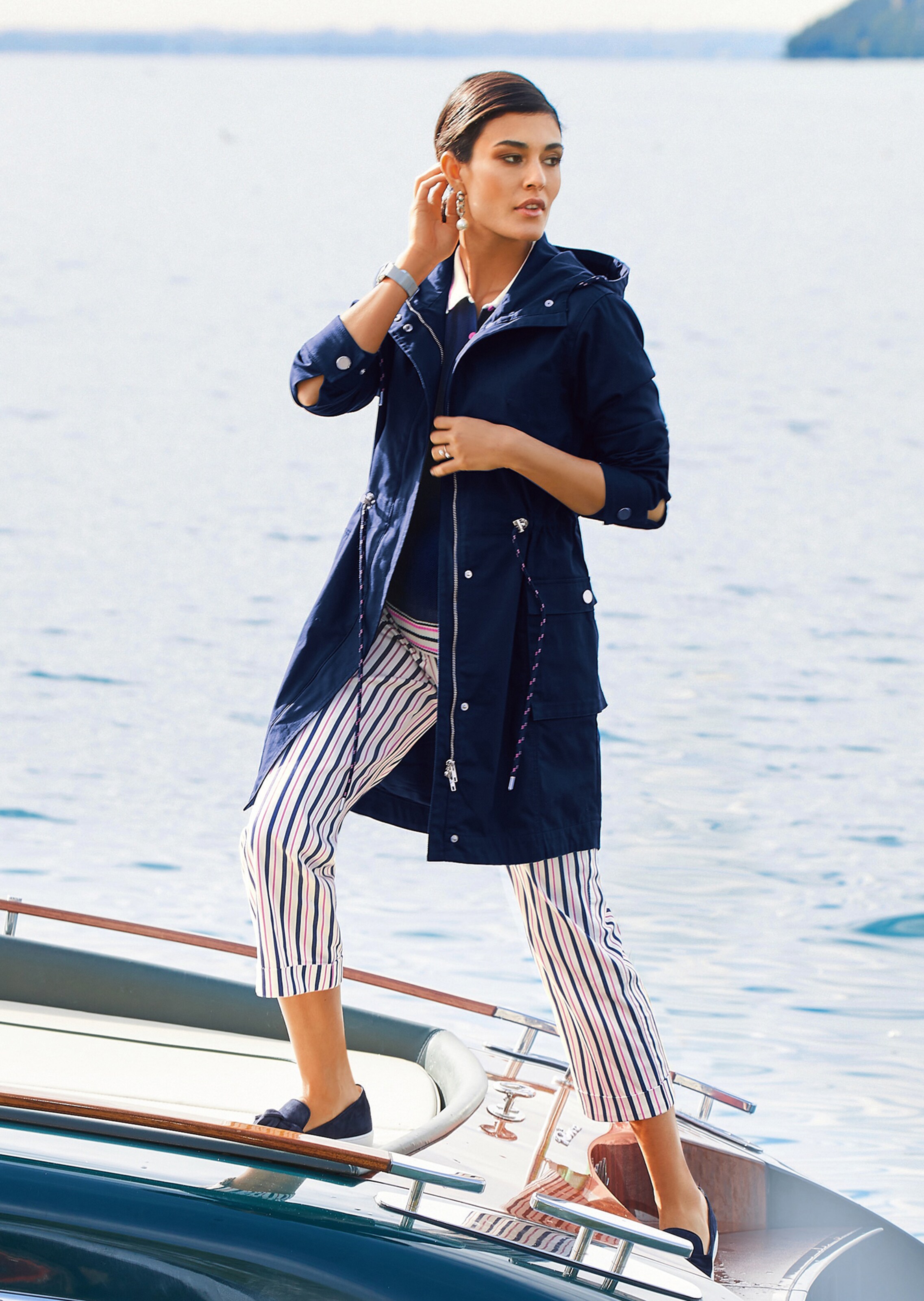 Chinos in stylischen Variationen verspricht uns diese Saison. Dazu gehört auch dieses modisch verkürzte Modell, das durch das effektvolle Streifenspiel den Marine-Look ganz neu interpretiert. Der edle Baumwollmix mit Stretchanteil verleiht Ihnen das fantastische Tragegefühl. Lässig und vorteilhaft auf ganzer Linie zeigt sich die Hose mit schrägen Schubtaschen im Vorderteil, angedeuteten Leistentaschen im Rückteil und Aufschlag am Beinsaum. Der Formbund mit diagonal verlaufendem Streifendessin setzt einen reizvollen Kontrast und ist mit Gürtelschlaufen, silberfarbenem M-Logo-Knopf und Innenbundsicherung mit Knopf gestaltet. Ein Trendmodell mit Wirkung – perfekt für den maritimen Modesommer!
