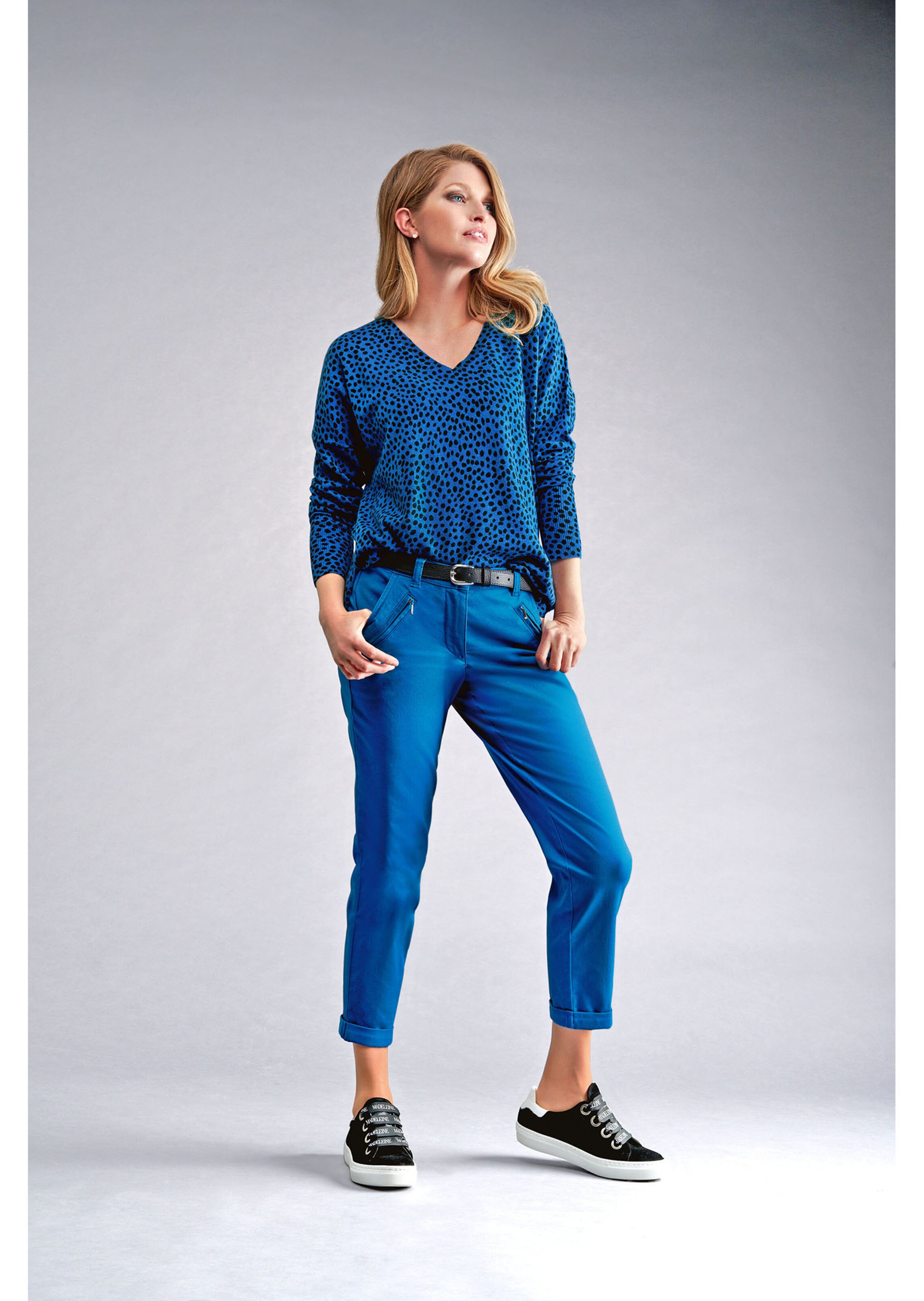 Sportliche Lässigkeit für unbeschwerte Sommertage. Diese Chino-Hose werden Sie die ganze Saison über lieben und immer wieder neu kombinieren. In neuer verkürzter Form beweist sie Modernität und wird durch kleine Saumaufschläge wirkungsvoll betont. Typisch die Details wie seitliche Eingrifftaschen, kleine Reißverschlusstaschen vorne und zwei geknöpfte Pattentaschen hinten. Der Formbund mit Gürtelschlaufen gewährt einen guten Sitz. Knöpfe und die kleine Plakette mit Madeleine-Logo-Prägung zeugen von der Herkunft des hochwertigen Modells. Durch den edlen Baumwoll-Stretch trägt sich die Hose sehr komfortabel und sorgt für ein angenehmes Trageklima.