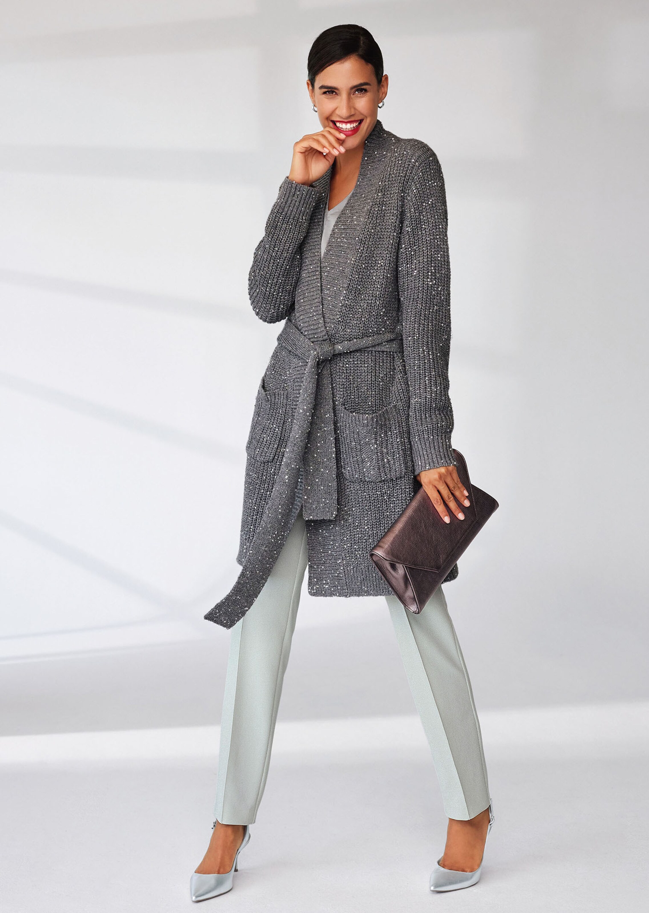 Glanzakzente machen Strickpartner zu echten Fashion-Highlights und bringen frischen Wind in die neuen Looks! Trageangenehm und kühl im Griff wird die lange Strickjacke mit Pailletten und Kaschmir-Anteil zum stylischen Key-Piece. Die verschlusslose Longform mit aufgesetzten Taschen wird per Bindegürtel modisch fixiert. Breite Rippenabschlüsse runden den Look ab.