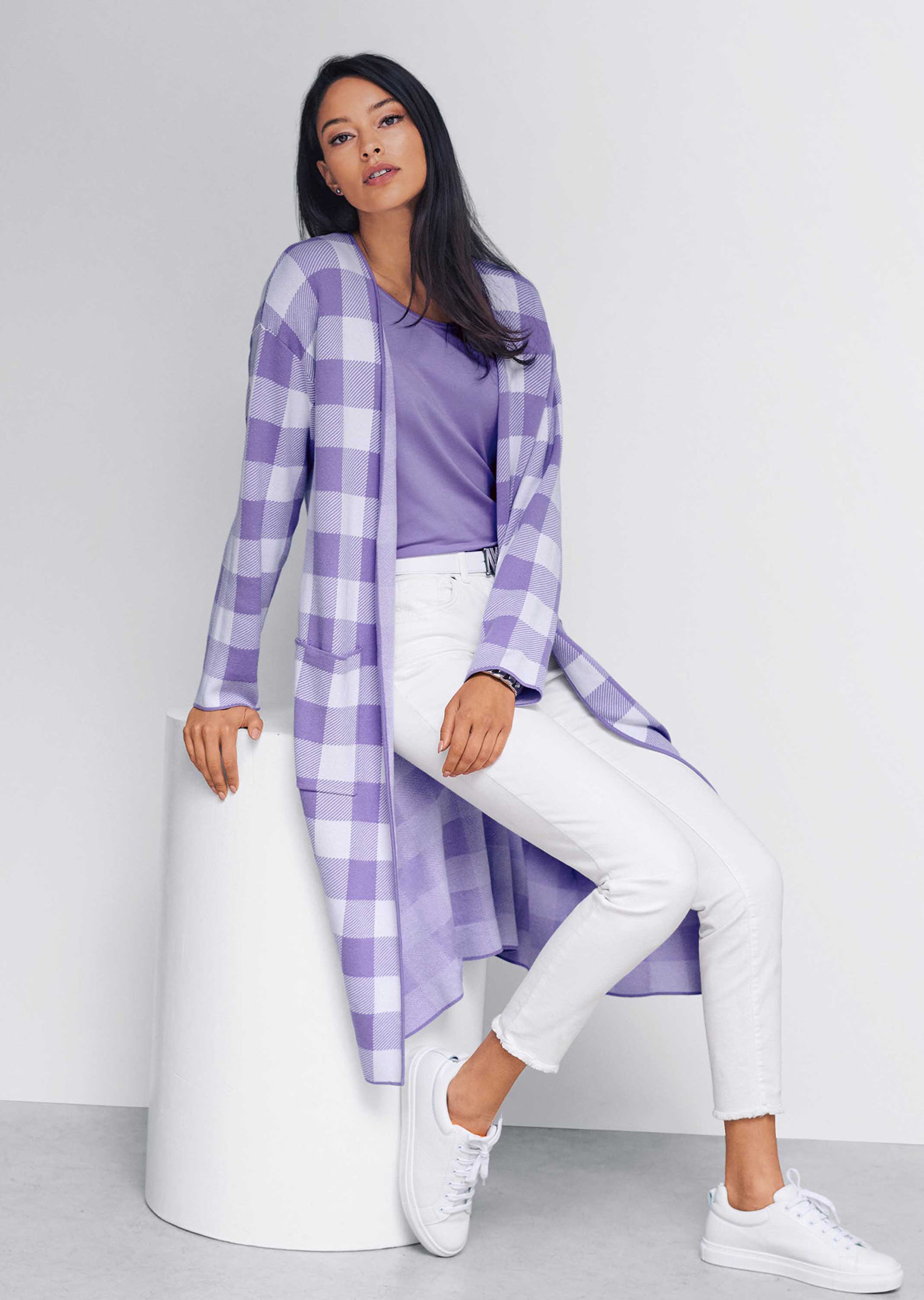 Leichte und verschlusslosse Strickmäntel sind absolute Must-haves der neuen Saison und verleihen angesagten Kombi-Varianten eine stylische Note! Der großflächige Karo-Jacquard des Lieblingsstücks zeigt sich in trendstarker Nuance und lässt sich besonders gut zu farb- und dessingleichen Partnern kombinieren. Die Oversize-Silhouette des Mantels sorgt für bequemen Tragekomfort und folgt dem aktuellen Lässig-Trend. Der Strickpartner wurde aufwendig in Form gearbeitet und mit überschnittenen Schulterpartien, langen Ärmeln sowie großen, aufgesetzten Taschen ausgestattet. Modische Tubular-Abschlüsse setzen edle Akzente und runden den Look mit viel Liebe zum Detail ab.