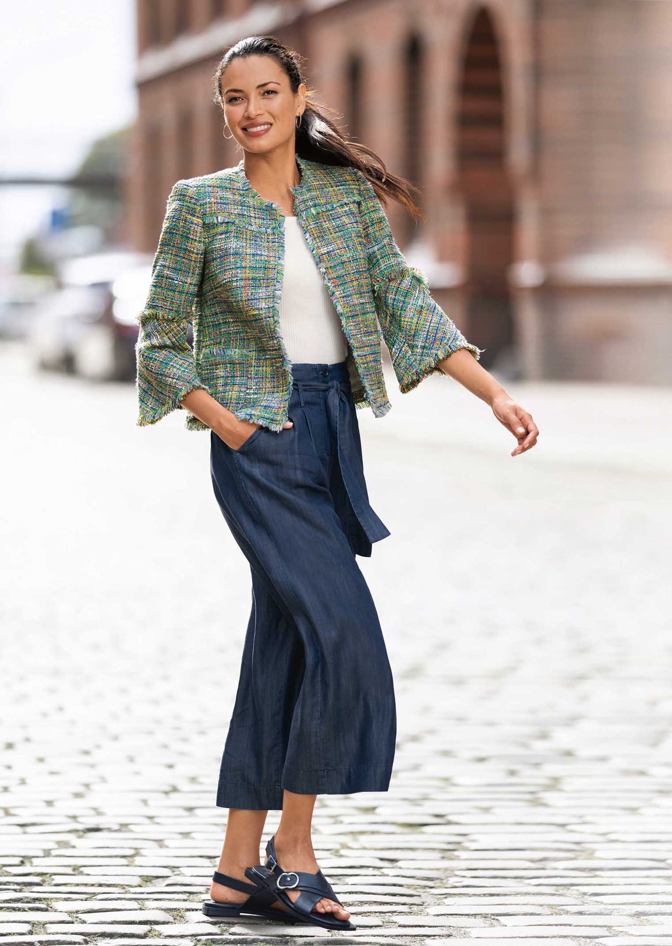 Eine typische Lieblingshose! Die weite, leichte Sommerhose trägt sich durch die fließende Lyocell-Qualität äußerst angenehm. Wir haben sie für eine moderne, lässige Optik als 7/8-Culotte mit erhöhtem Formbund, betont weitem Bein, Logoknöpfen, Innenbundsicherung und Gürtelschlaufen gestaltet. Schubtaschen, ein Bindegürtel, Ziergesäßtaschen und Bundfalten sind weitere Details. Kombinieren Sie sie zu farbigen Partnern für einen femininen Trendlook der Saison.