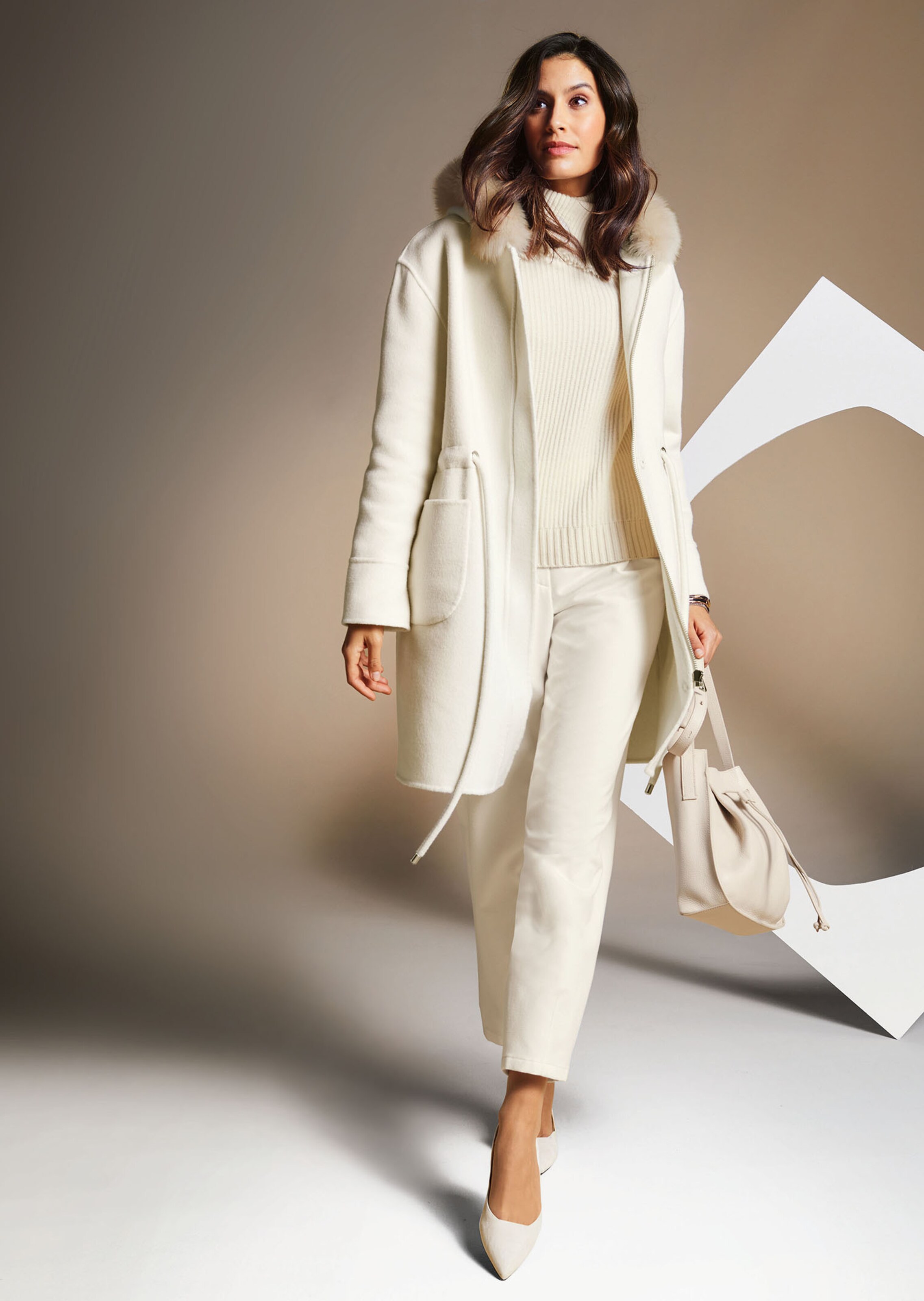 Der Parka zeigt sich von seiner kuschelig sanften Seite und macht in hochwertiger Doubleface-Qualität Lust auf Winter. Der softe, doppellagige Wollmix trägt sich herrlich leicht und verwöhnt mit wohliger Wärme. Futterlos verarbeitet kommen seine zwei schönen Seiten optimal zur Geltung. Der Fake Fur in Lammfell-Optik an der Kapuze ist abnehmbar und unterstreicht den Edel-Look auch optisch. Betont lässig im Schnitt zeigt sich der Mantel stiltypisch mit überschnittener Schulter, Frontverschluss mit Druckerleiste und verdecktem Zipper sowie großen, aufgesetzten Taschen. Ein Taillen-Tunnelzug mit regulierbarer Kordel bringt das Modell feminin auf Figur. Ein Fashion-Liebling für jede Spiel-Art: So sieht der Parka nicht nur zu Hosen, sondern auch zu Kleidern fantastisch aus.