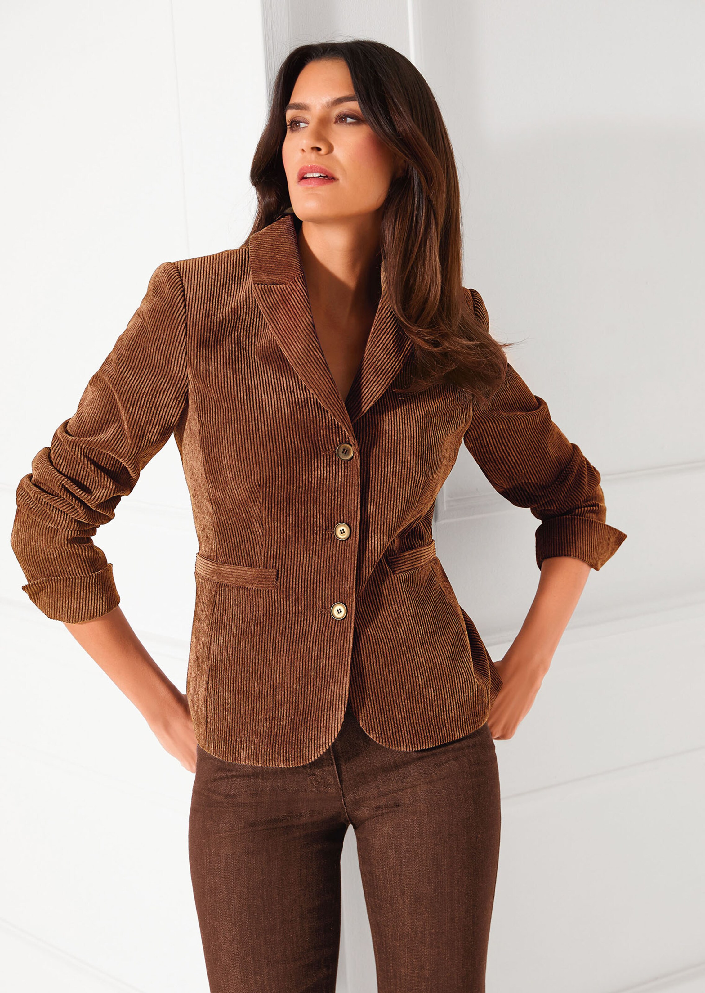 Matière souple avec du stretch. Coupe légèrement cintrée. Col à revers, poches côtés et boutons assortis. Manches à retrousser avec fente et empiècement intérieur. Doublure ton sur ton.