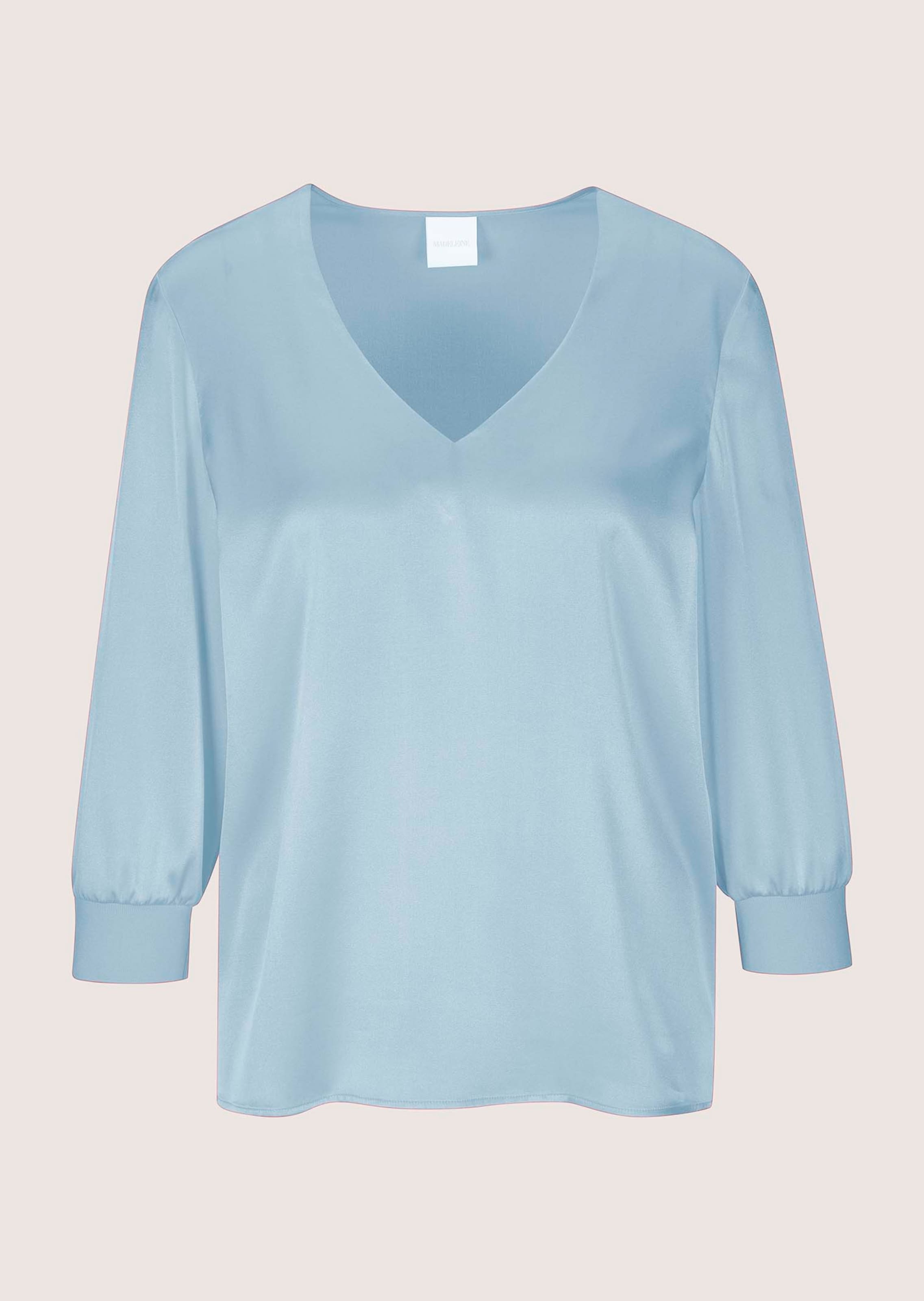 Soie stretch haut de gamme au toucher luxueux. Encolure en V féminine qui allonge la silhouette et manches 3/4 légères et agréables avec empiècements en maille côtelée. Base droite.