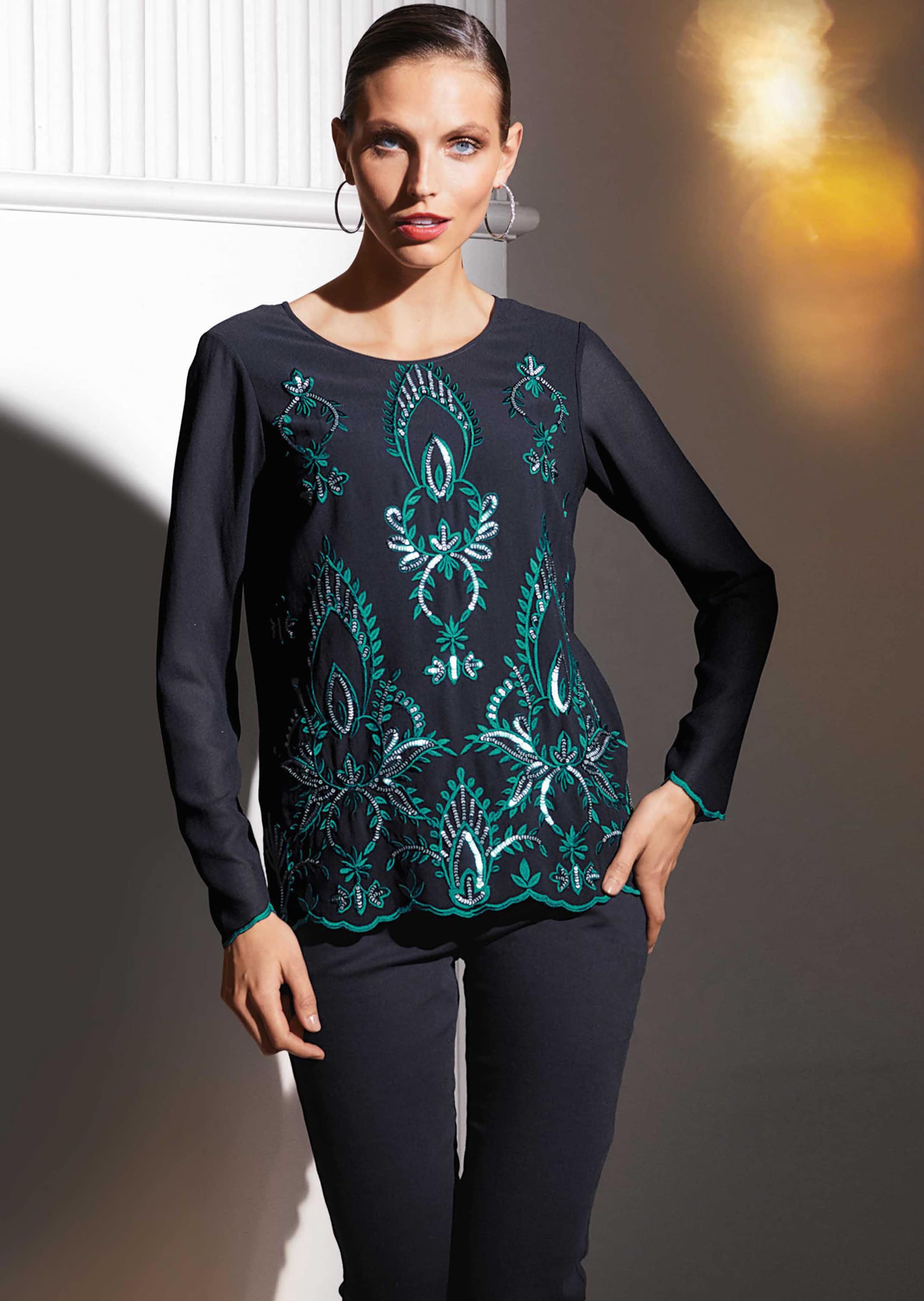 Riche broderie et paillettes devant. Coupe légèrement cintrée. Encolure arrondie, buste avec doublure opaque et manches longues semi-transparentes. Fermeture boutonnée au dos et bords écailles contrastants.
