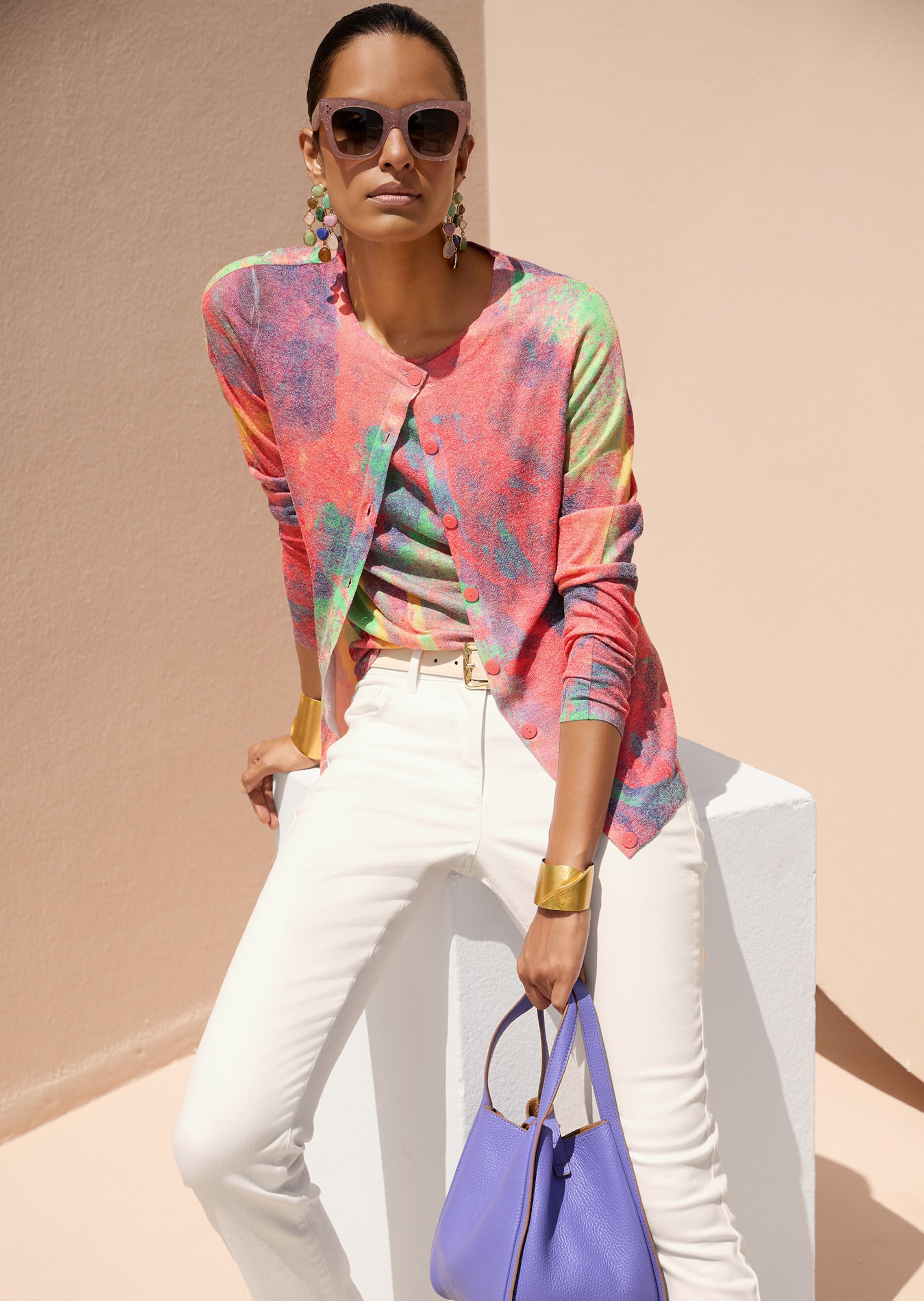 Fine maille très agréable avec sublime imprimé: chaque cardigan est unique. Encolure arrondie, bande de boutonnage et manches longues.