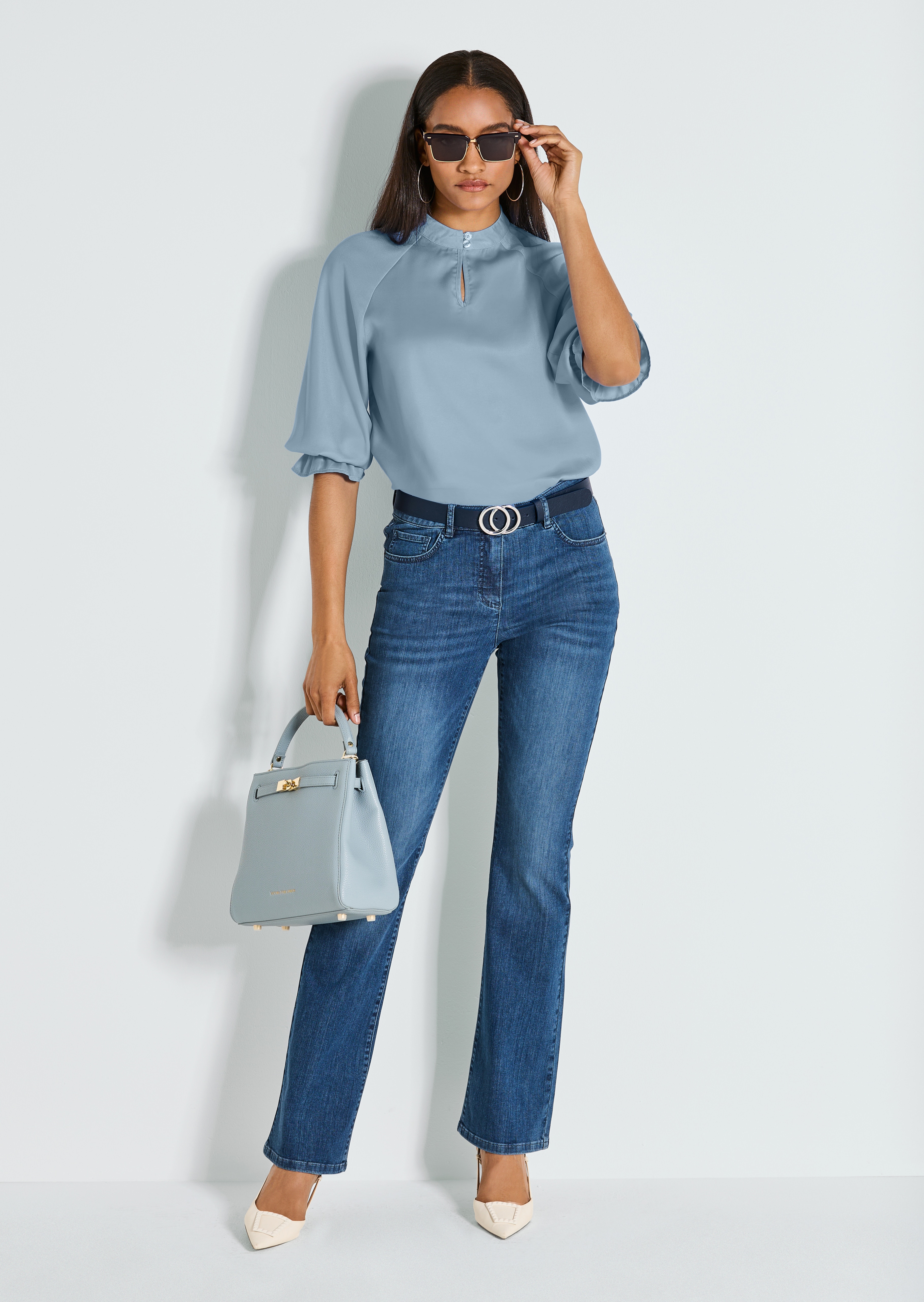 Douce et agréable sur la peau. Fente sur le décolleté qui se prolonge jusqu'au col montant. Petite fermeture par boutons en nacre et brides sur le col. Manches 3/4 raglan élastiquées.