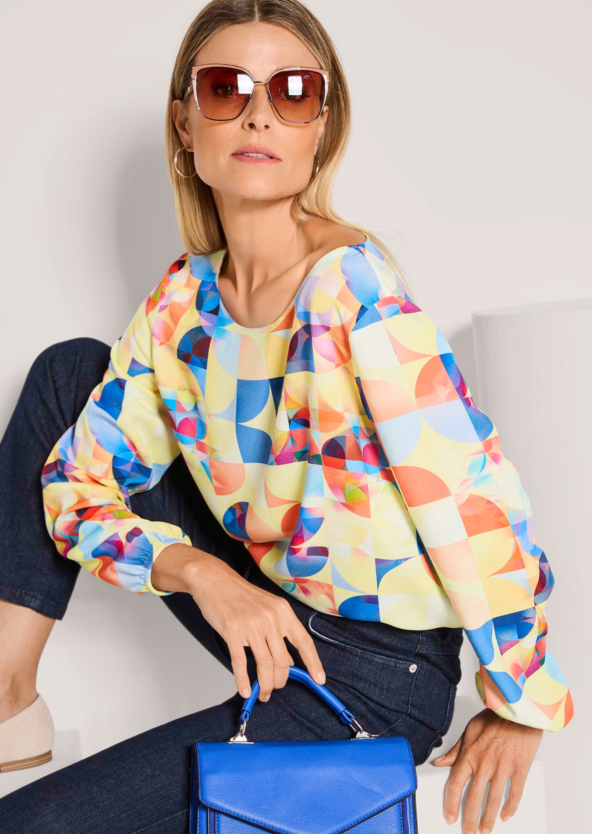 Blouse avec imprimé intégral graphique au coloris lumineux. Ravissant motif géométrique qui apporte du peps à vos tenues les plus variées! Coupe décontractée qui flatte la silhouette. Confection soignée en pure viscose légère et fluide. Encolure arrondie et manches longues faciles à retrousser grâce à la finition extensible.