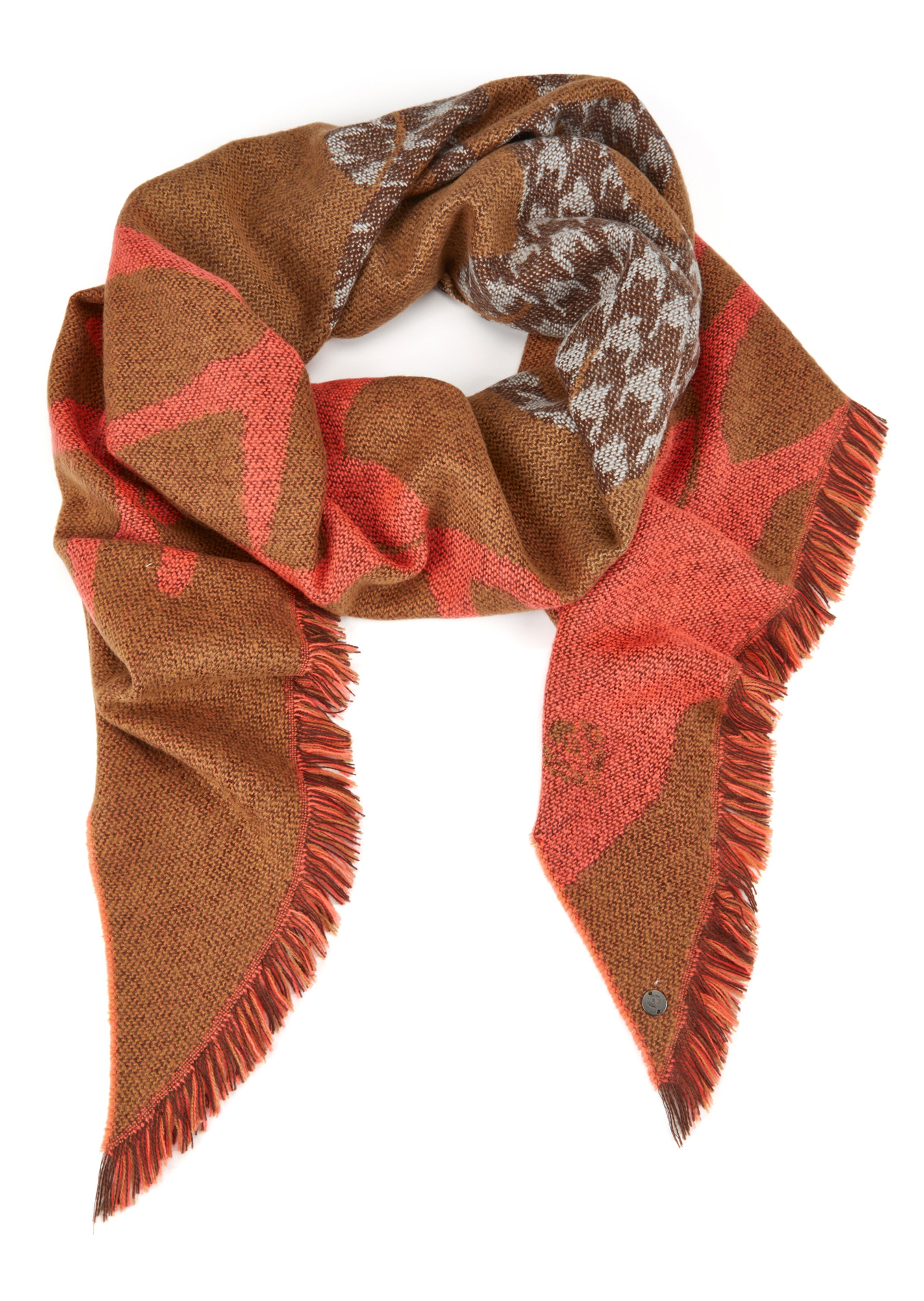 Chaud et douillet, motif cerf. Nouvelle forme tendance, avec côtés travaillés en biais et franges. À porter comme une écharpe, ou même à la place d'une veste à la demi-saison.