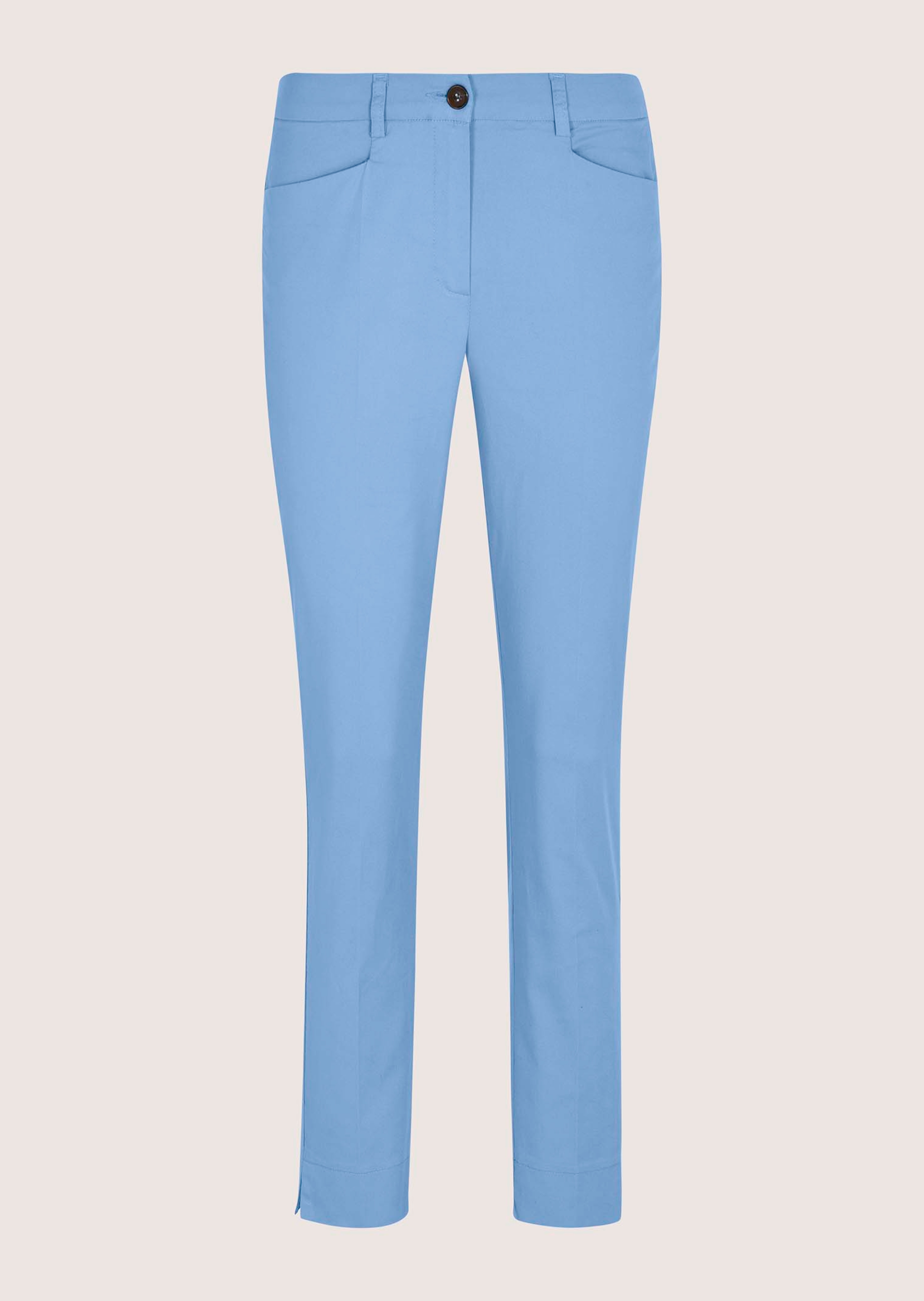 Pantalon chino à la coupe classique, en coton stretch souple, avec passants de ceinture et poches. Fausse poche au dos, plis marqués et petites fentes latérales au bas des jambes.