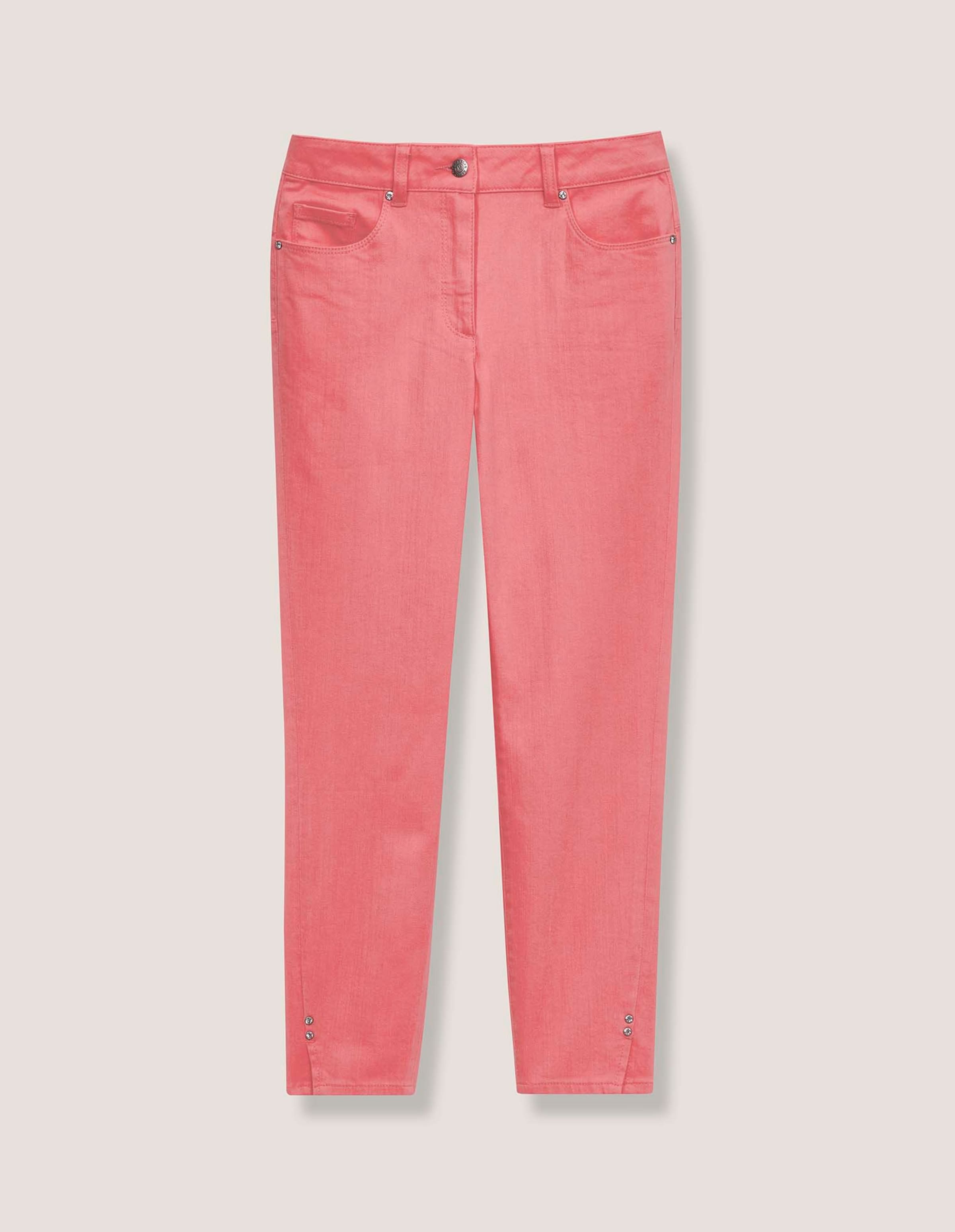 5 poches. Ligné élancée avec empiècement au dos et rivets aux poches et fente au bas des jambes.