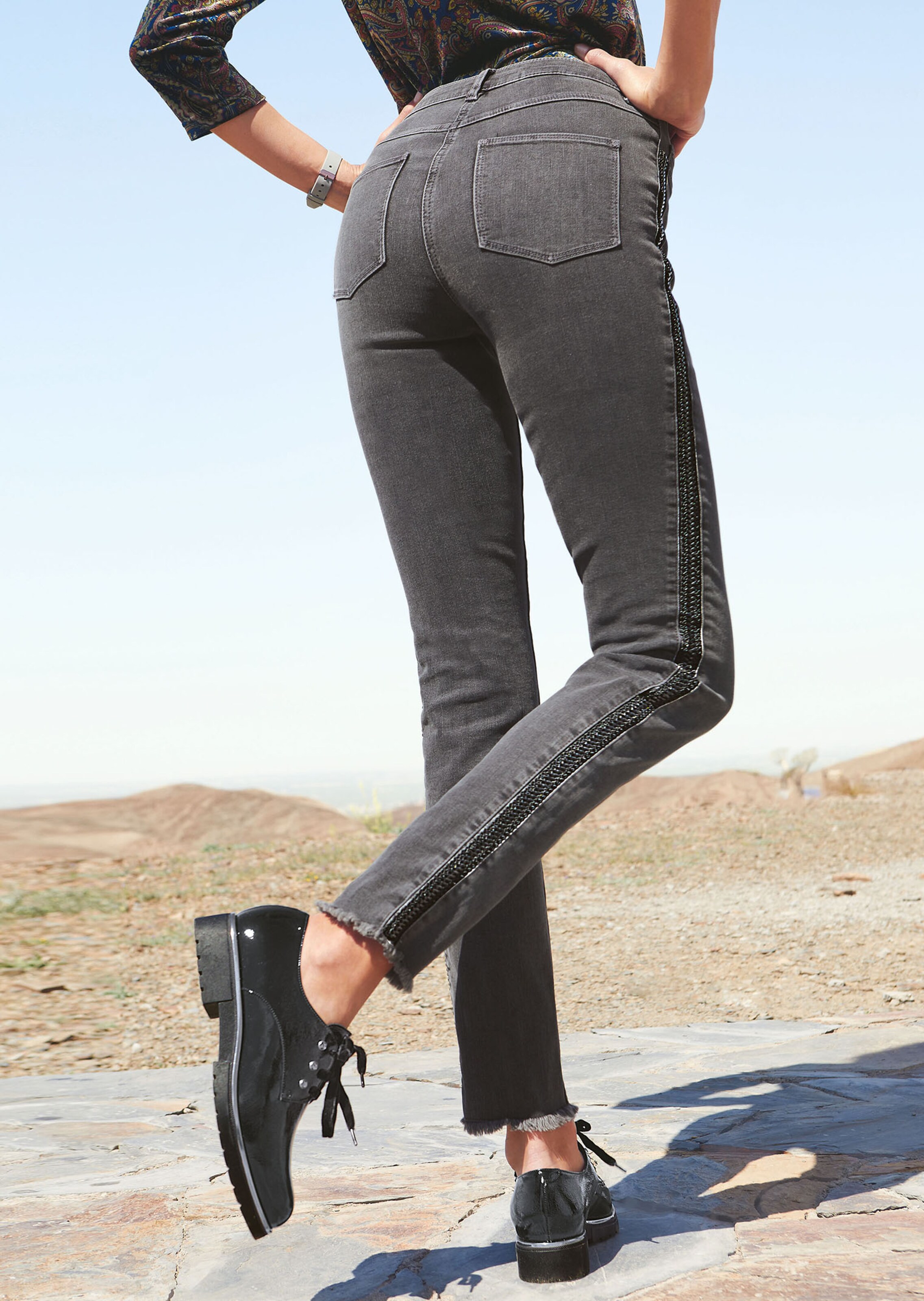Chic et décontracté. Bande tressée fantaisie sur les côtés et détails en matière synthétique. Coupe slim mode, 5 poches. Franges au bas des jambes et effets délavés.