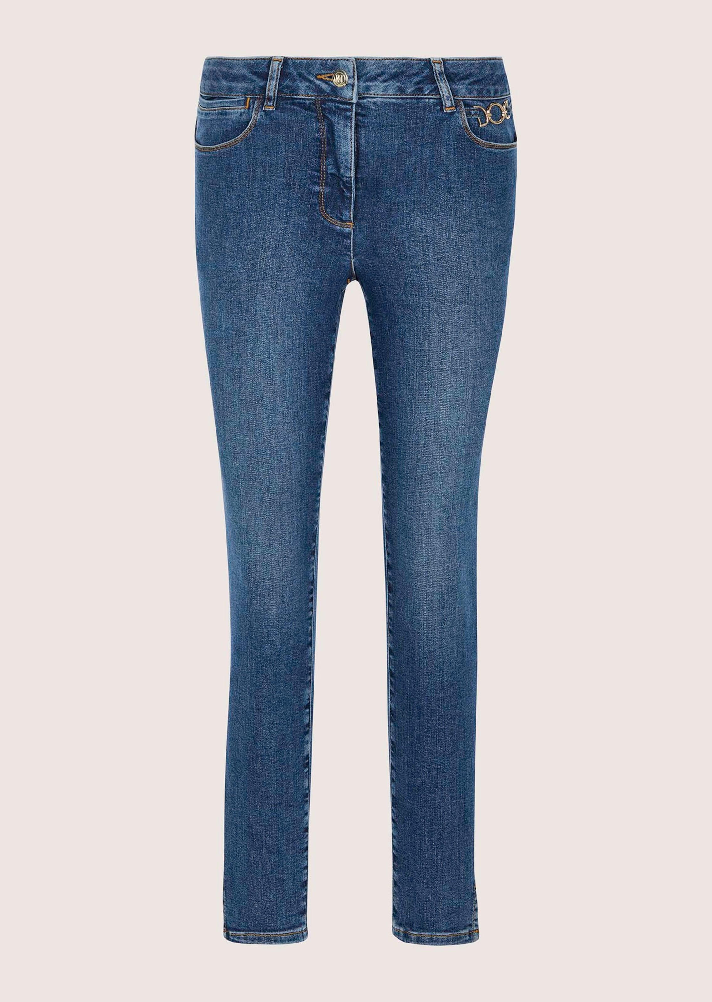 Les jeans à la ligne ajustée font leur grand retour. Ligne slim, style 5 poches. Coutures contrastantes, chaîne fantaisie sur la poche et bouton logo M. Passants de ceinture et petites fentes latérales au bas des jambes.