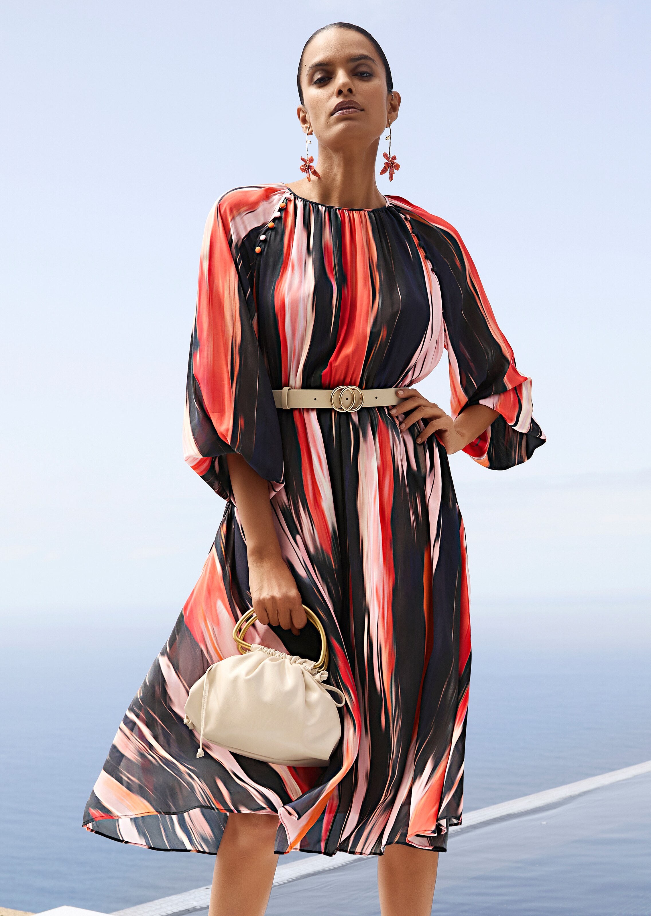 Robe avec rayures contrastantes aux couleurs intenses. Viscose fluide avec doublure et détails raffinés: boutons recouverts au bas des manches, encolure arrondie et taille élastiquée. Manches longues raglan avec bord élastiqué, poches côtés dans les coutures et fermeture au dos par bouton et bride.
