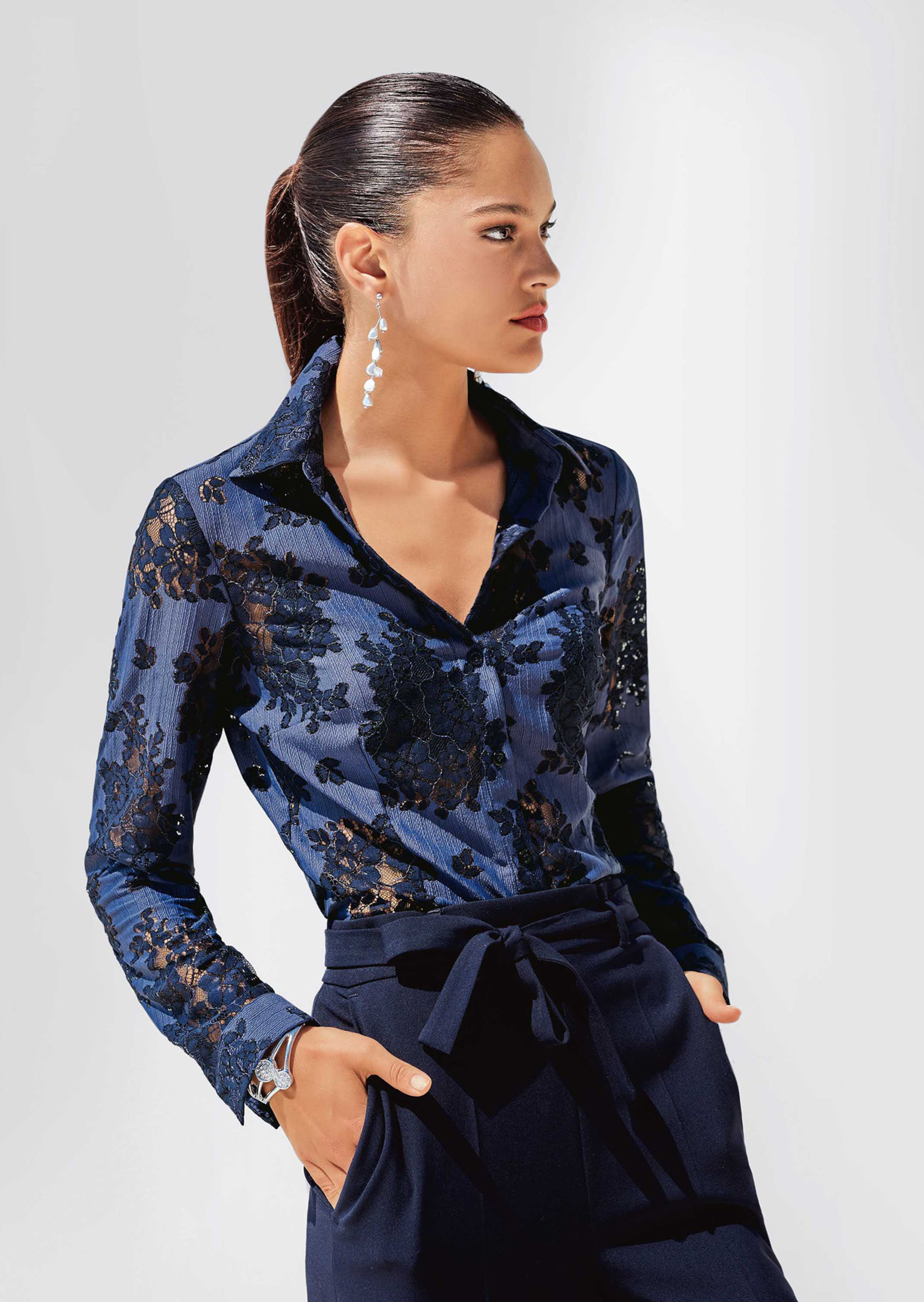 Détails en dentelle florale semi-transparente. Chaque chemisier est unique! Coupe classique. Col chemise, bande de boutonnage, base arrondie et manches longues à poignet boutonné.