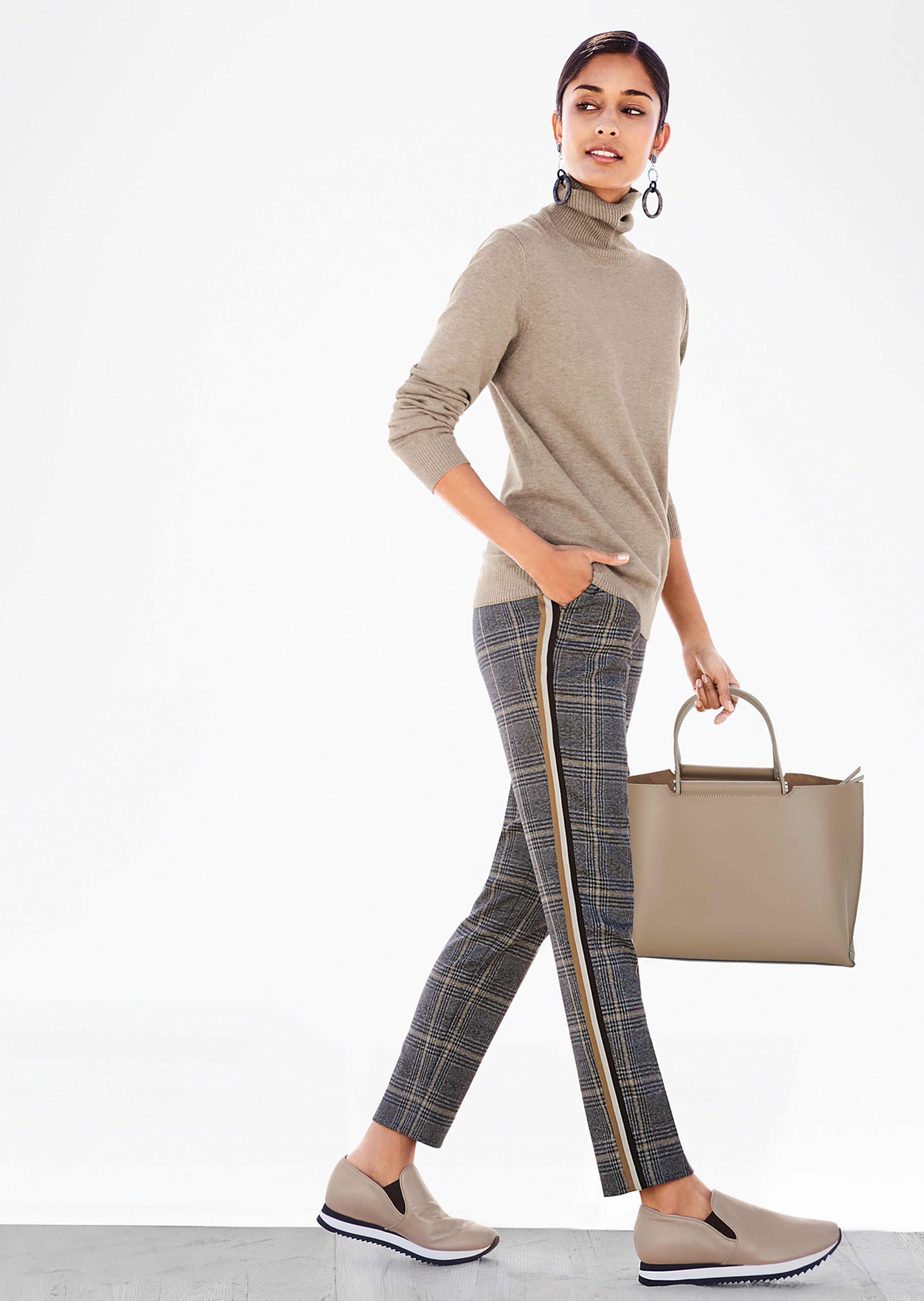 Bande contrastante sport sur les côtés. Coupe cigarette, longueur cheville. Ceinture élastiquée au dos avec agrafes et bouton à l'intérieur. Plis marqués, poches côtés et poches au dos.
