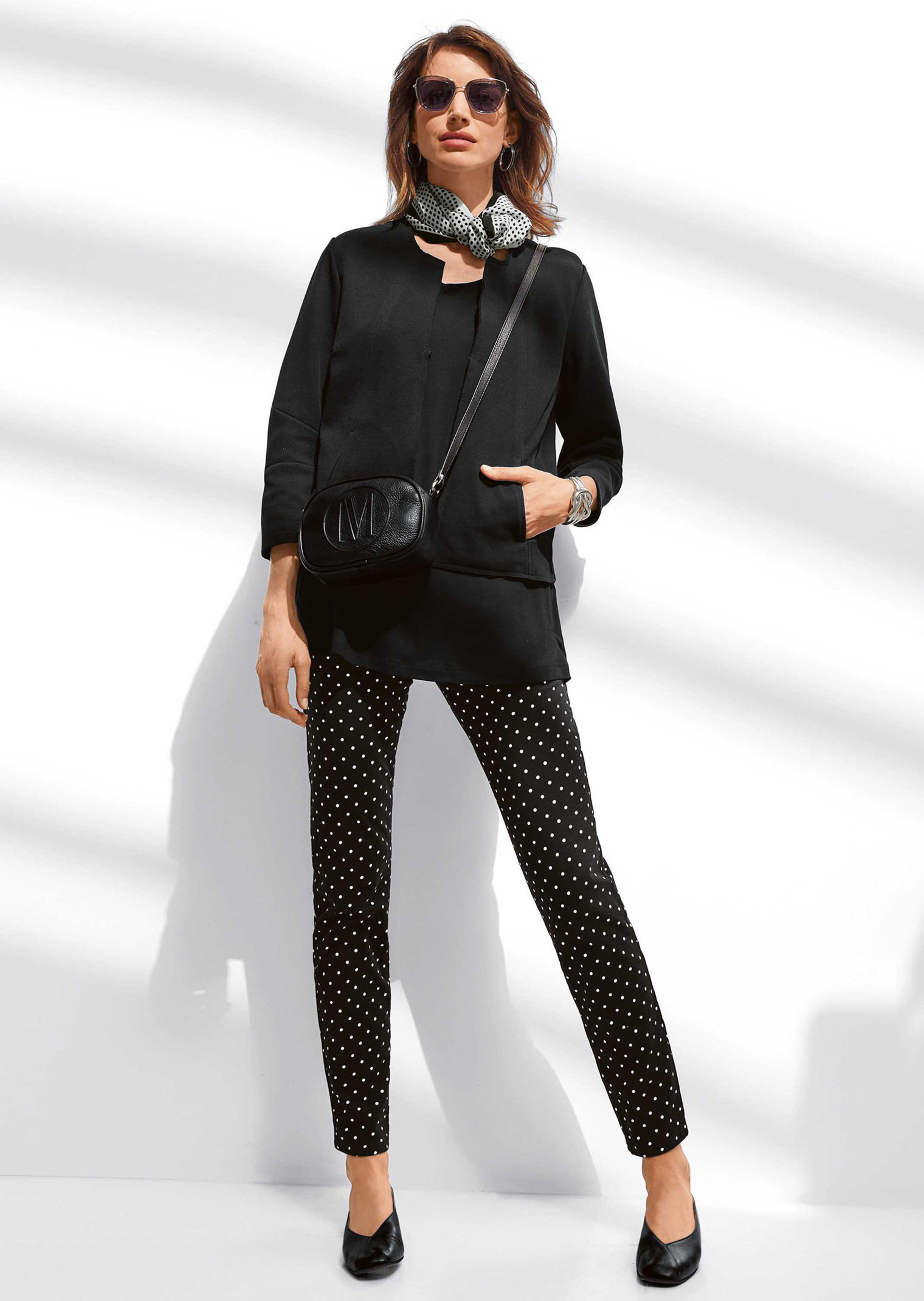 Élégant modèle au motif pois intemporel. Coupe élancée longueur cheville. 5 poches. Passants, bouton logo et empiècement en V au dos.