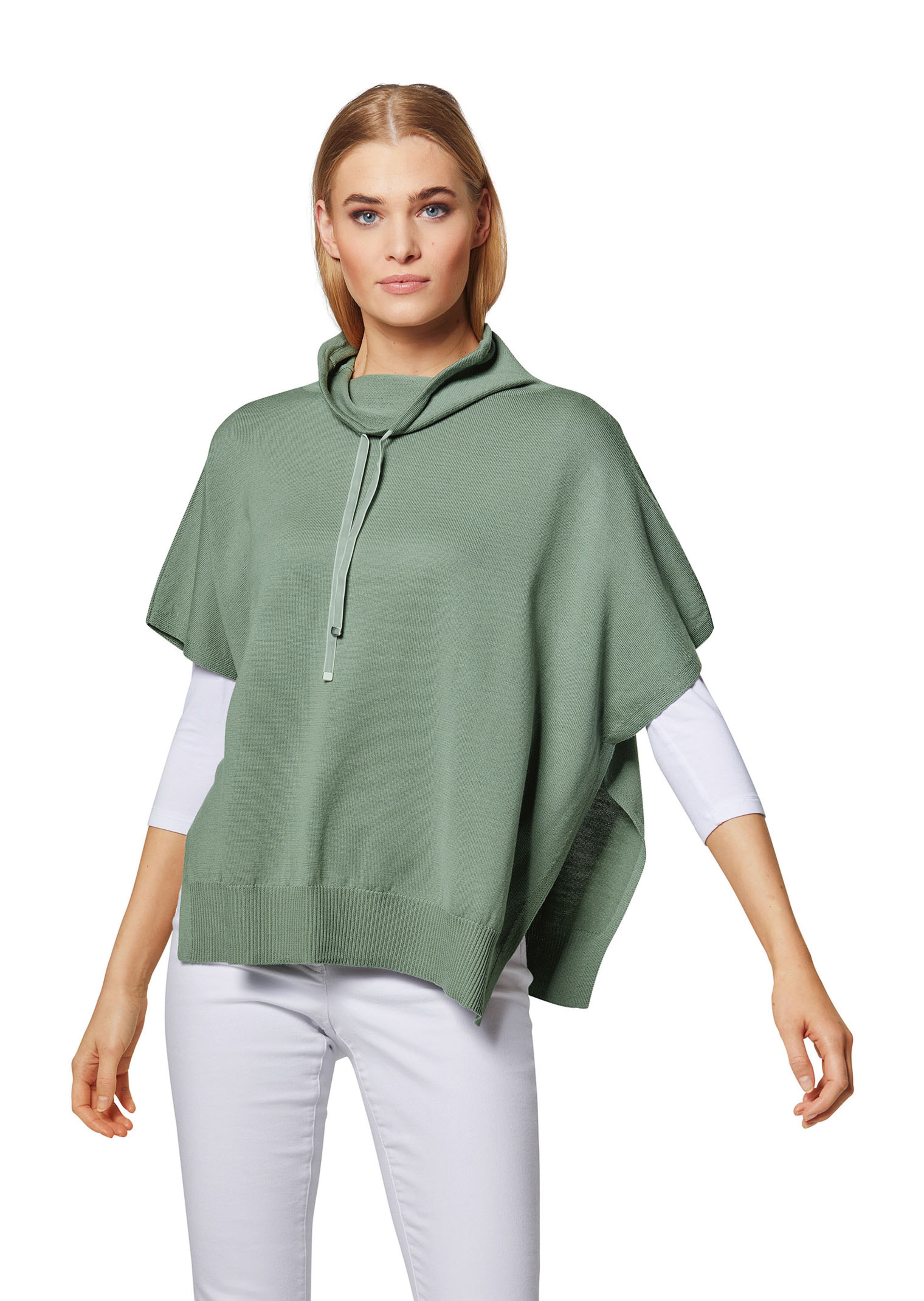 Modèle tendance à la coupe maxi décontractée. Laine vierge durable haut de gamme. Manches coude, bords-côtes à la base et fentes latérales. Col roulé dégagé, réglable par ruban en velours avec stoppers en métal.