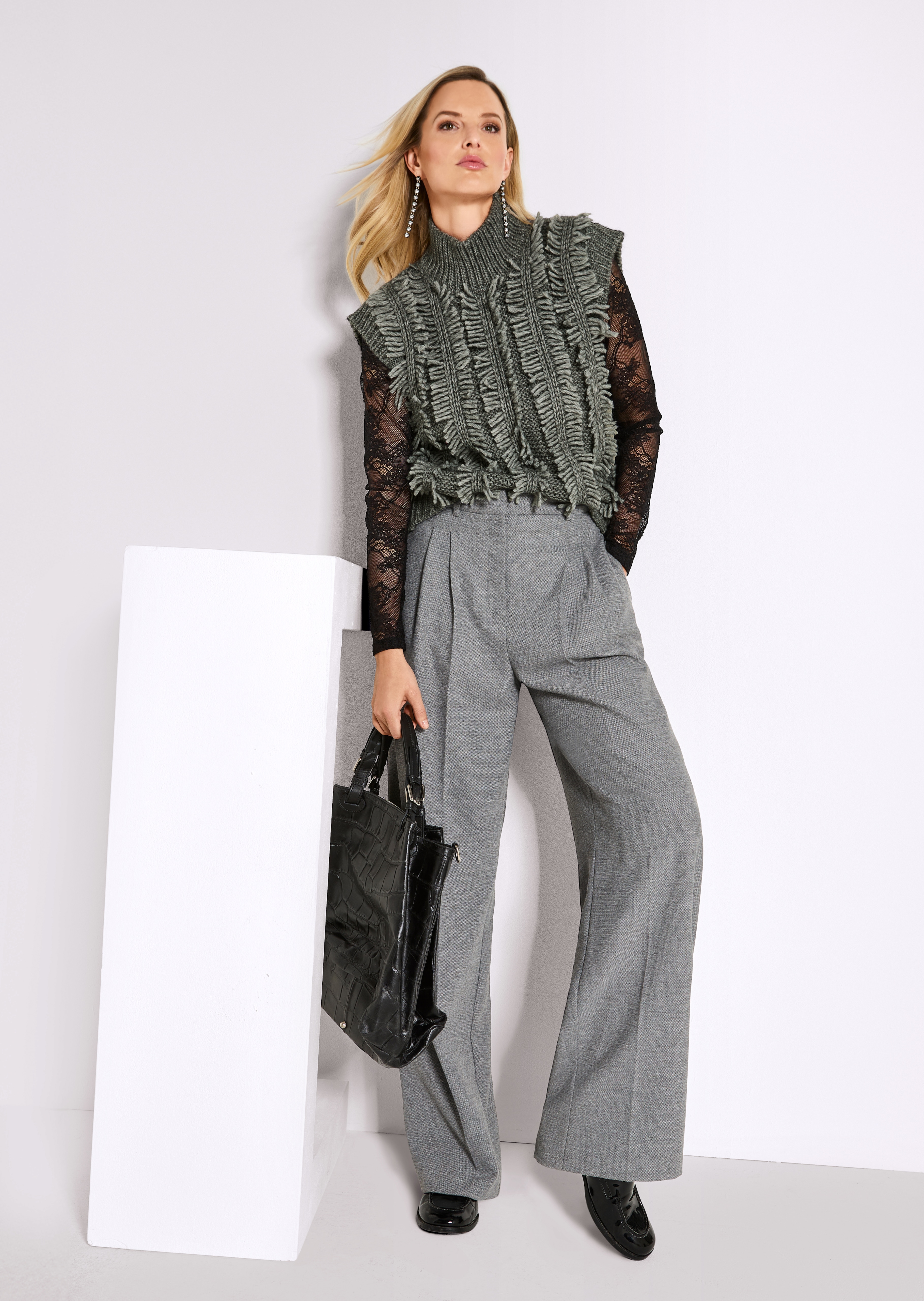 Maille fantaisie à franges devant et dos en maille jersey endroit. Col montant souple et épaules légèrement descendues. Fins détails en maille côtelée sur le col, sur les emmanchures et à la base.