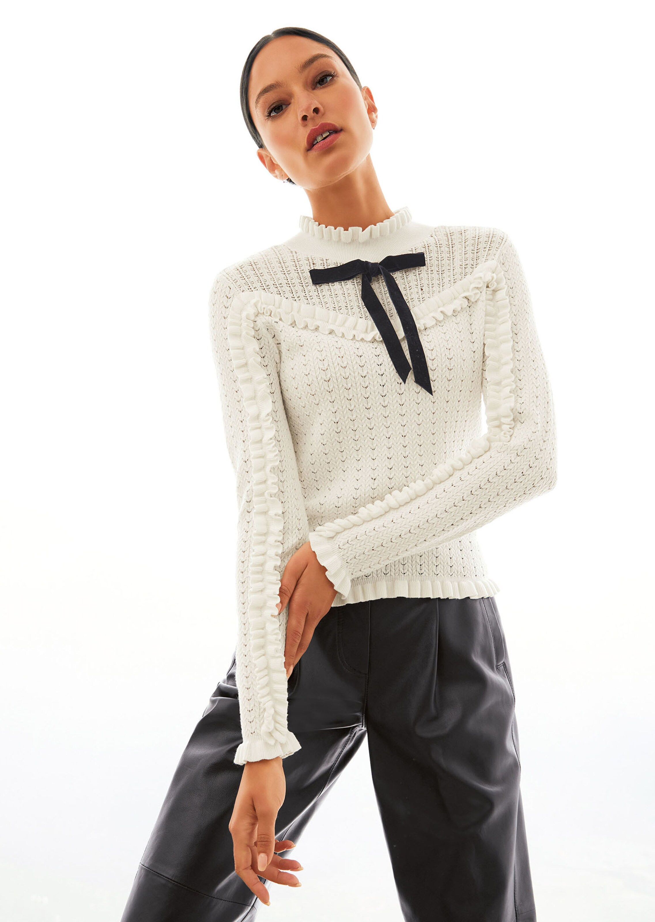 Maille ajourée douce. Ligne élancée. Tricoté fully fashioned. Nœud en velours amovible. Fines bandes avec ruchés sur le col montant, à la base, sur les manches, au bas des manches et sur le décolleté.