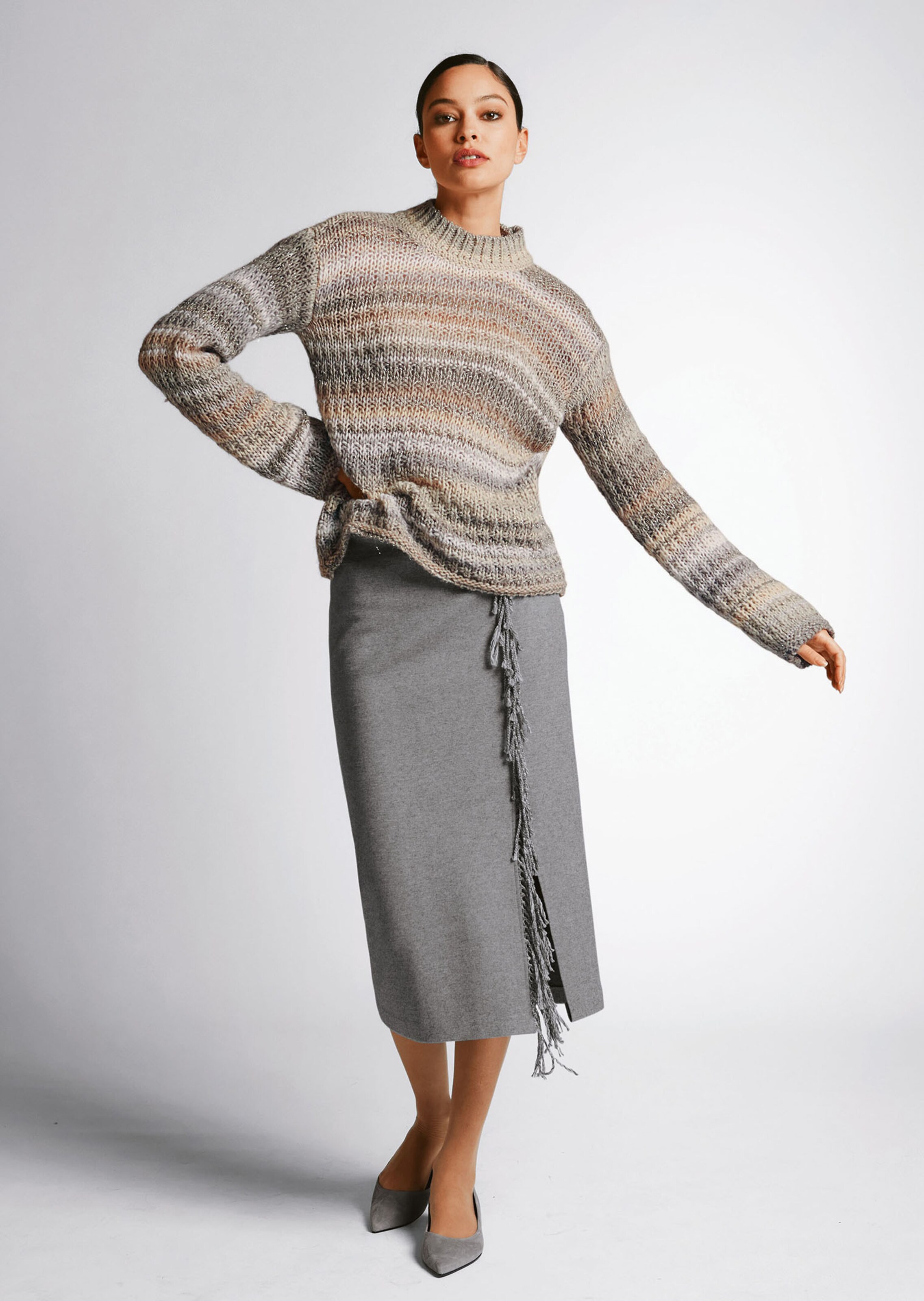 Grosse maille semi-transparente à l'harmonieux dégradé de couleur avec effet fil brillant. Style décontracté. Col montant, épaules descendues, manches longues et bords-côtes.