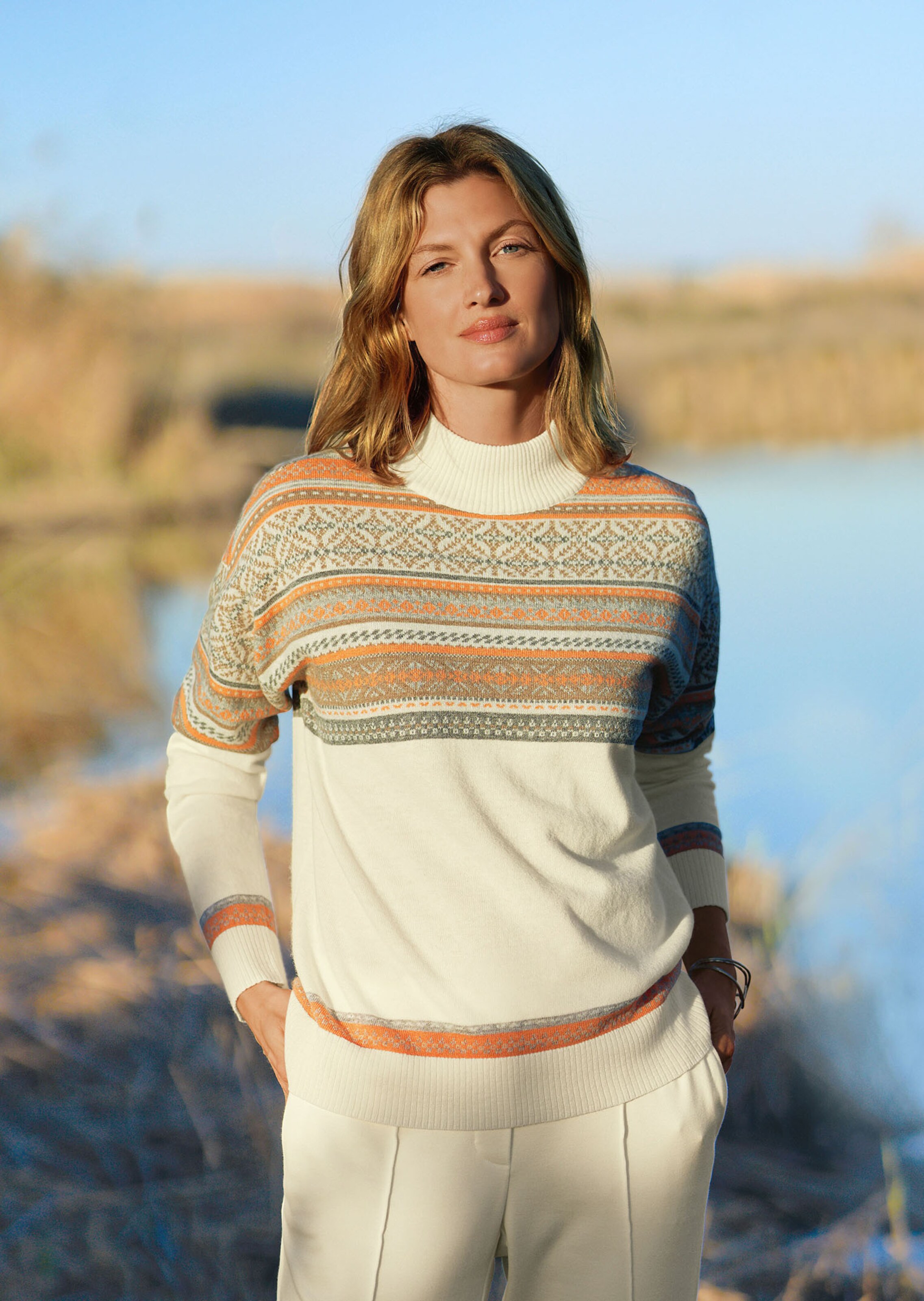 Maille jacquard avec épaules descendues, manches longues et bords-côtes unis.
