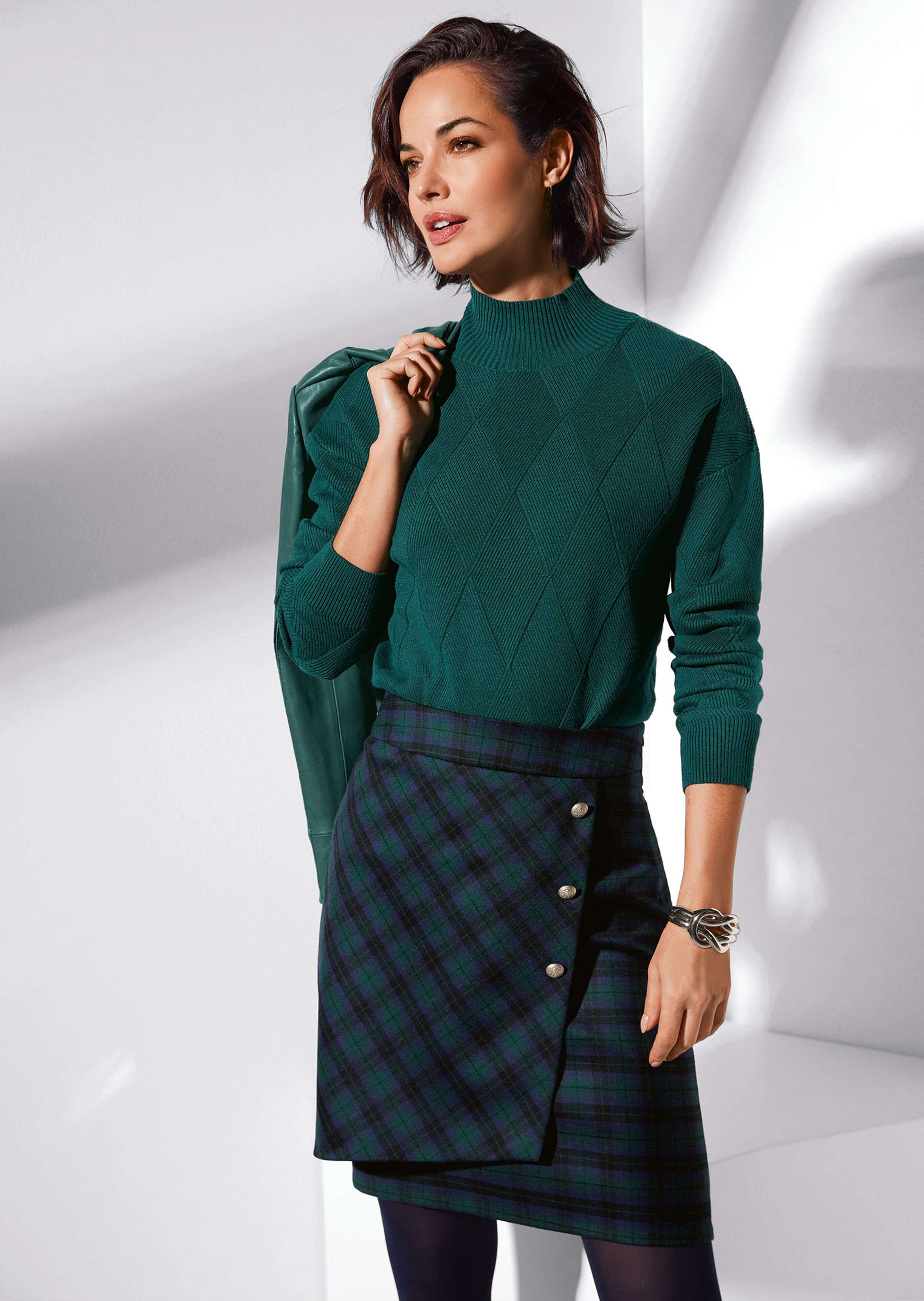 Stretch de viscose souple. Grand motif losanges. Coupe légèrement cintrée. Col montant en maille côtelée, épaules descendues et manches longues. Bords-côtes au bas des manches et à la base.