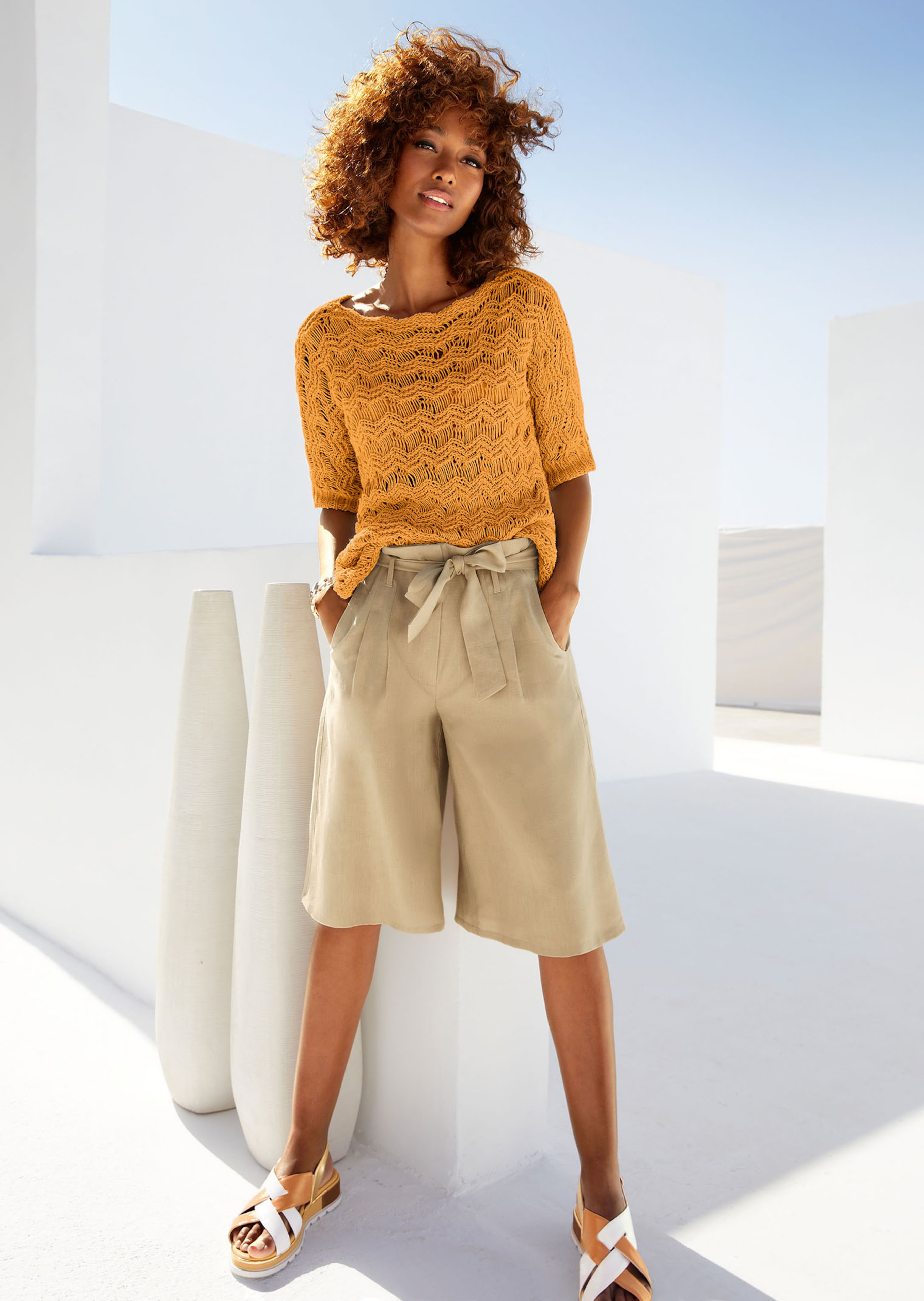 Maille fantaisie zigzag en fil italien. Coupe décontractée. Épaules descendues et manches courtes.
