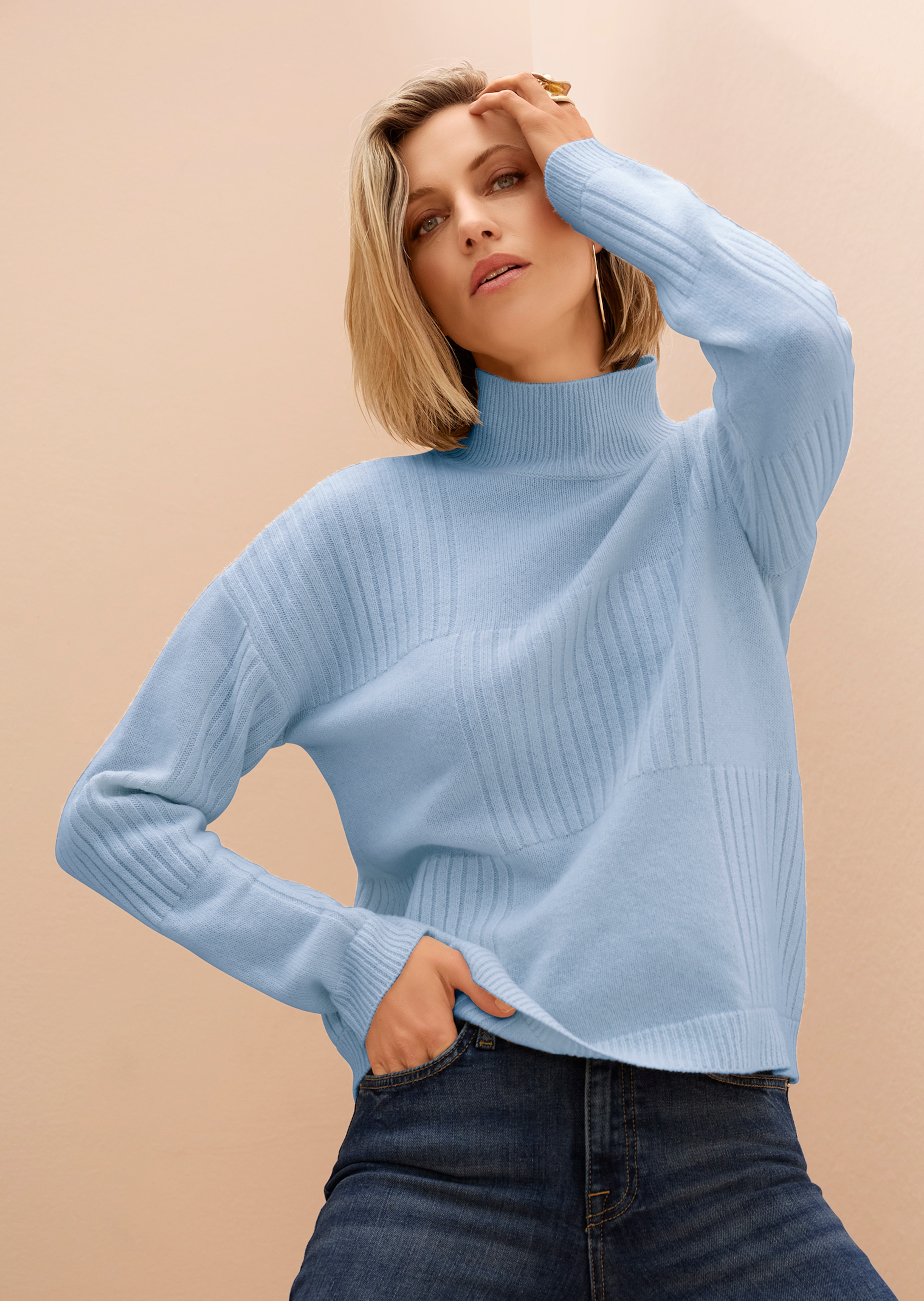 Fil naturel haut de gamme au toucher très doux et structure en relief. Coupe courte décontractée. Col montant et bas des manches longues en maille côtelée d'une tenue irréprochable.