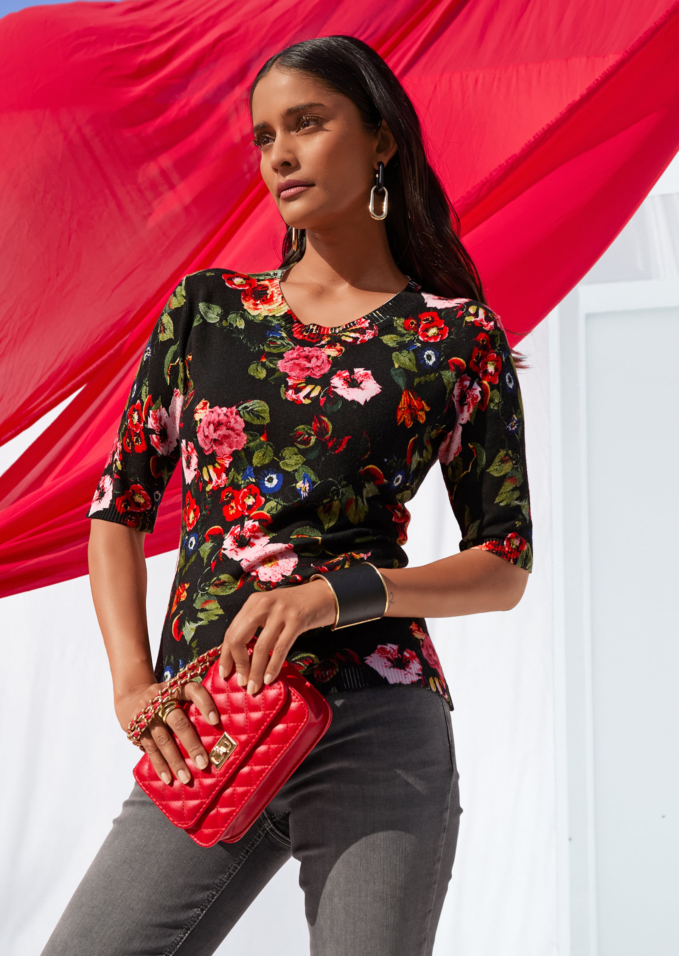 Fil mélangé estival, frais et agréable sur la peau. Imprimé unique aux couleurs intenses. Bords-côtes d'une tenue irréprochable sur l'encolure arrondie et au bas des manches coudes.