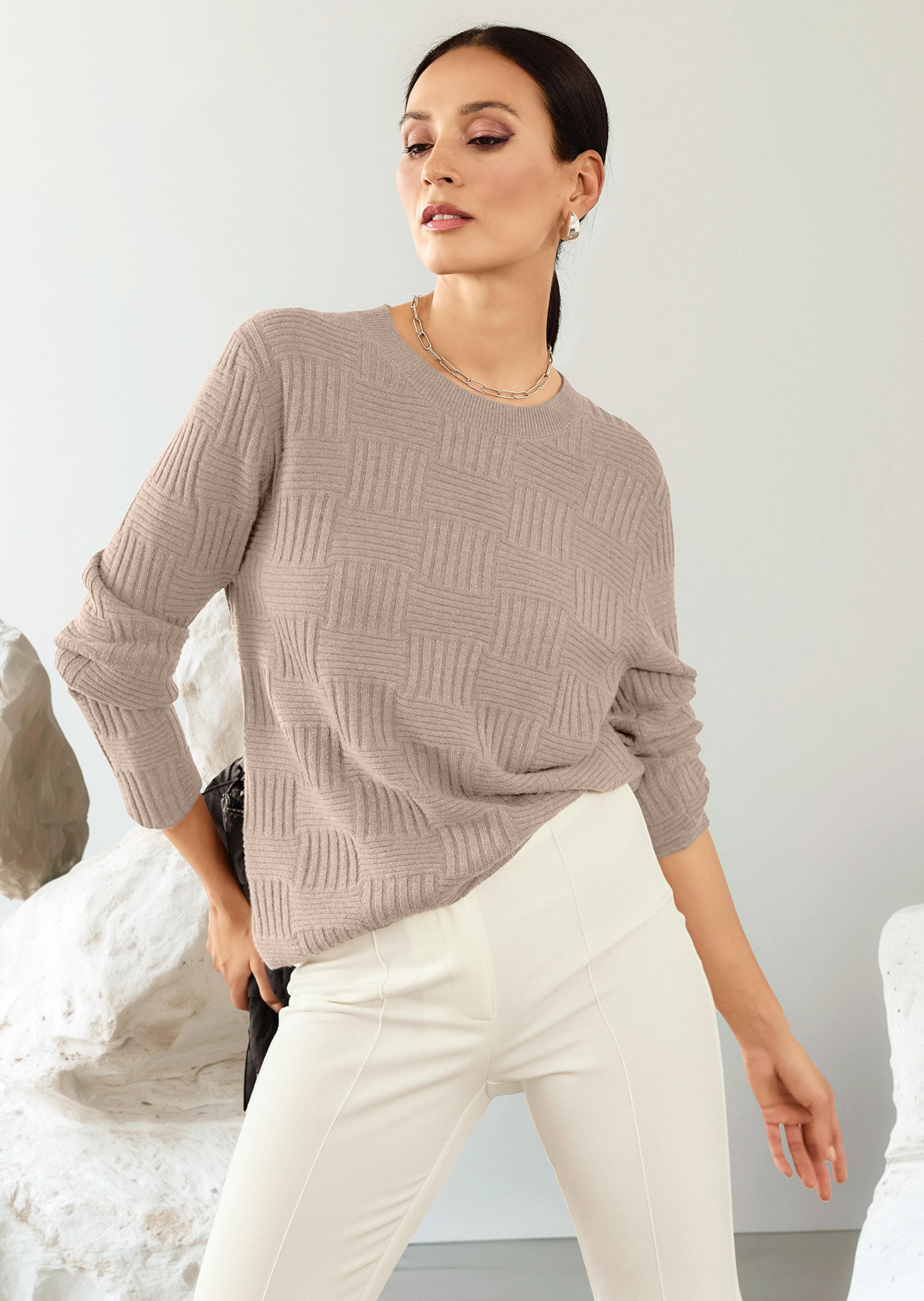 Fil mélangé duveteux riche en cachemire Good-Cashmere, rehaussé d'un fil fantaisie brillant, avec sublime mix de motifs. Tricoté fully fashioned. Encolure arrondie classique et manches longues.