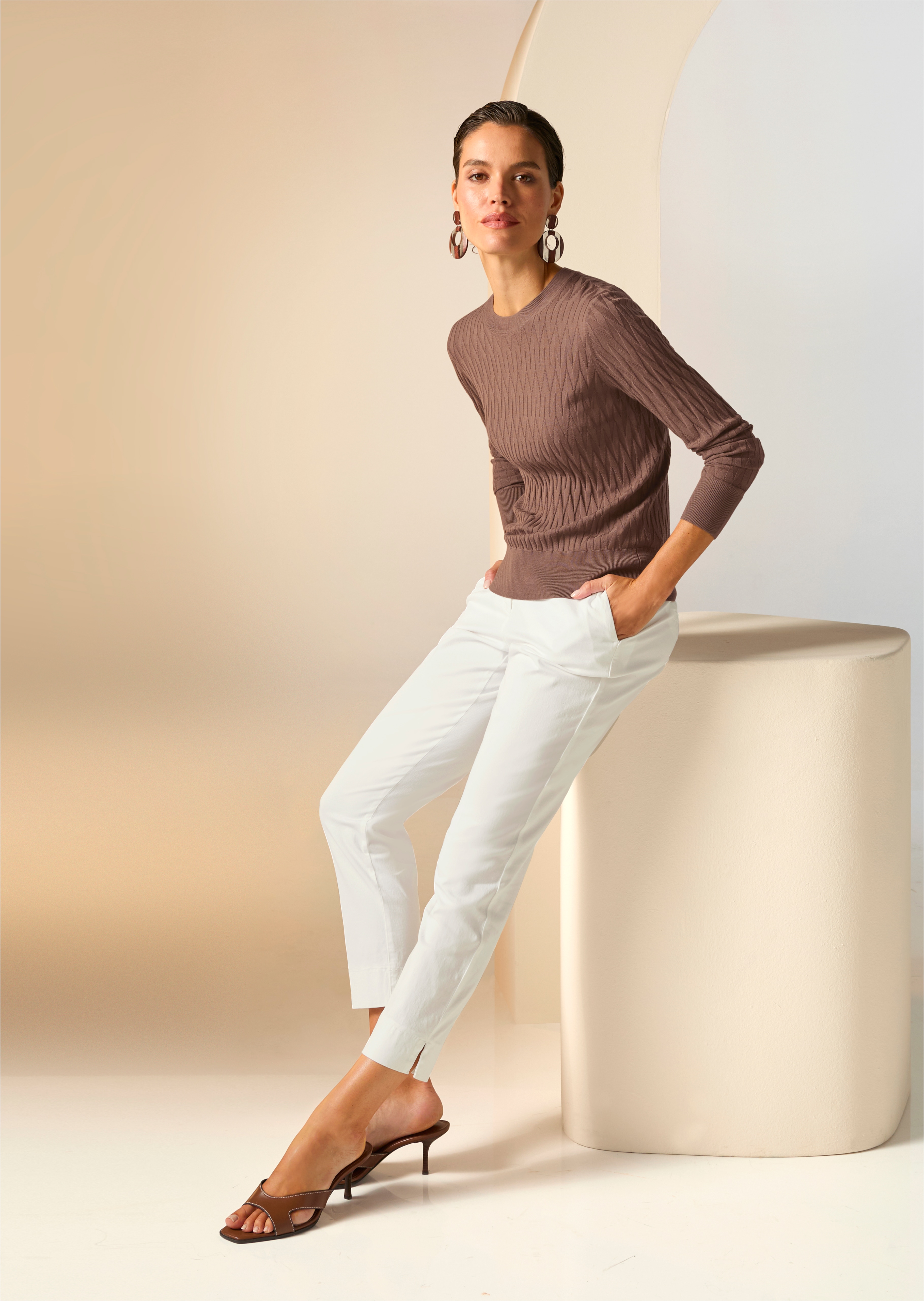 Fine maille ultralégère en fibre naturelle avec point fantaisie structuré. Encolure arrondie classique et manches longues. Ligne ajustée.