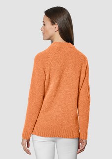 Maille duveteuse. Ligne légèrement cintrée. Encolure arrondie et manches raglan longues. Encolure, bas des manches et base en maille côtelée.