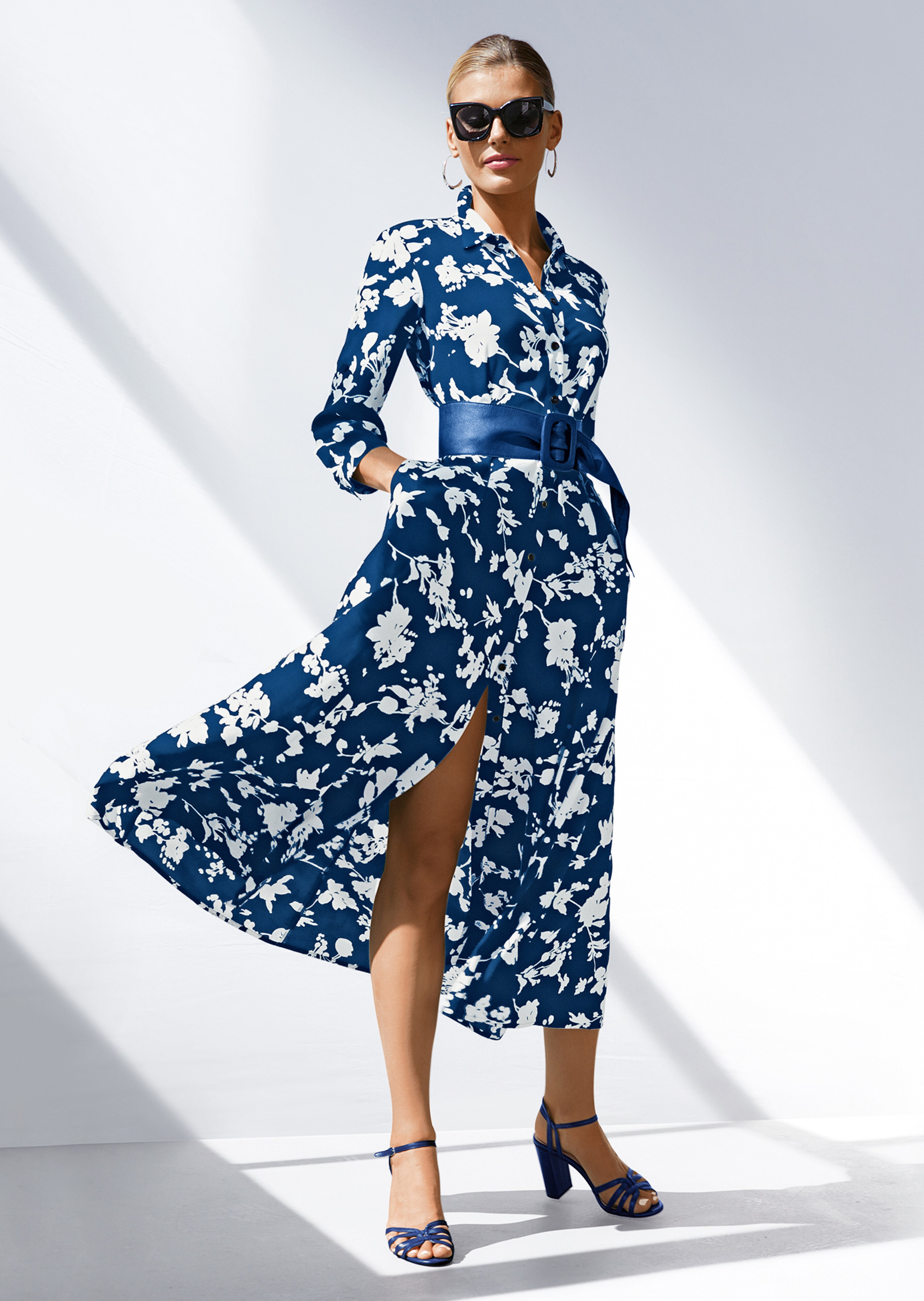 Imprimé floral bicolore. Chaque robe est unique! Longueur mode. Col chemise à boutonner, bande de boutonnage, ceinture à nouer, passants et poches couture. Manches 3/4 à retrousser et à fixer par bride boutonnée et poignets réglables.