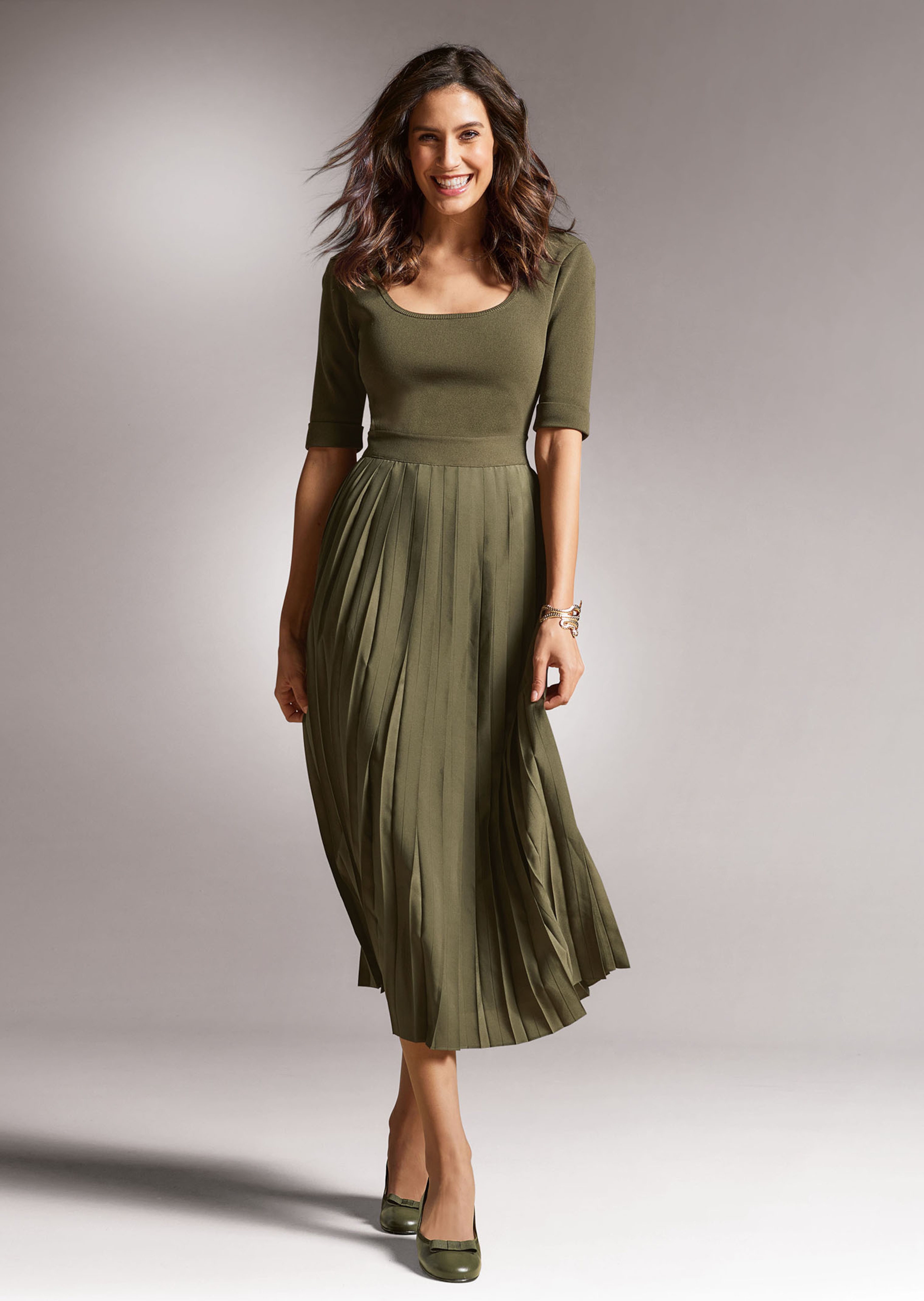 Silhouette féminine avec maille lisse en haut et jupe plissée. Profonde encolure arrondie. Manches courtes avec revers. Zip dans la couture sur le côté.